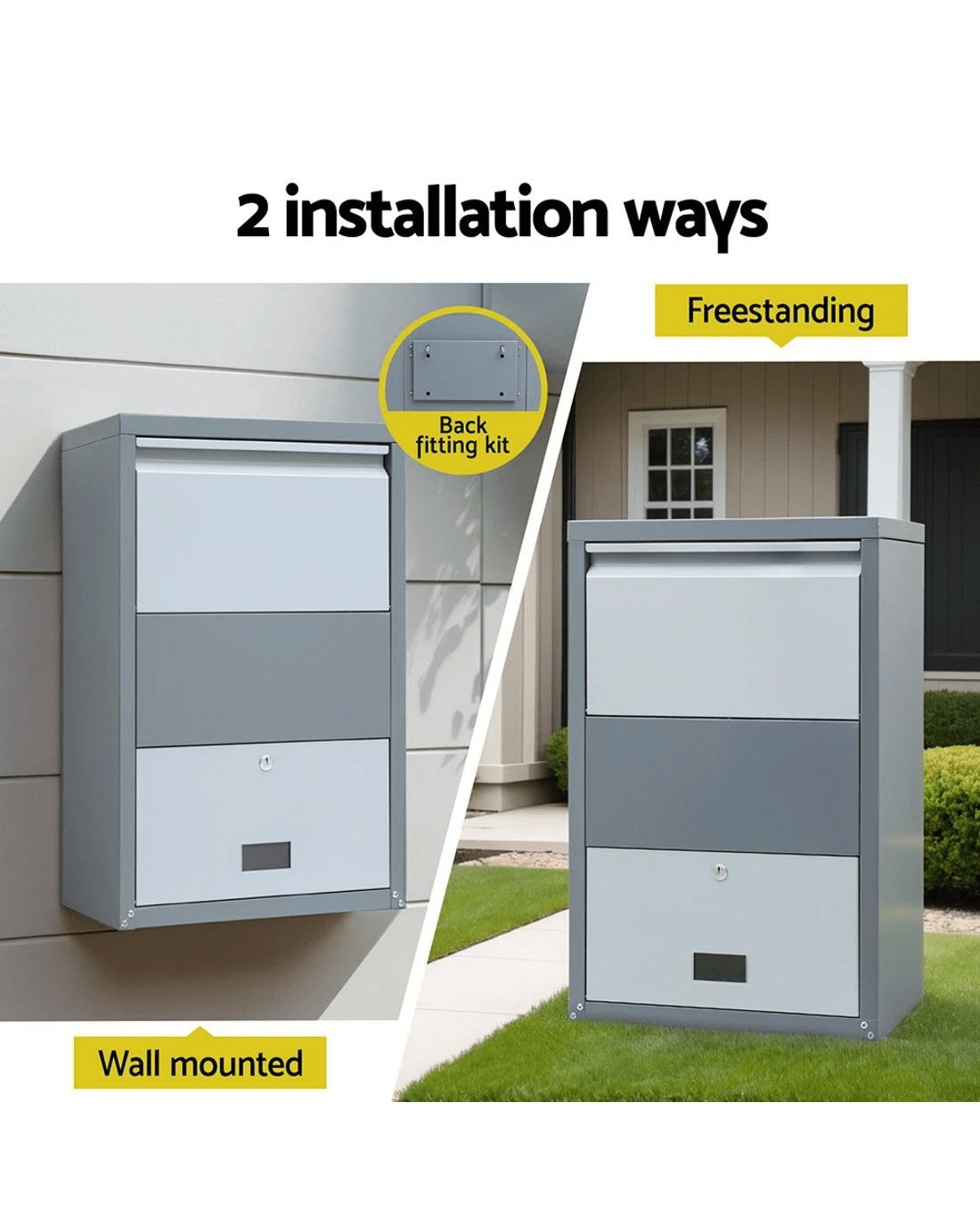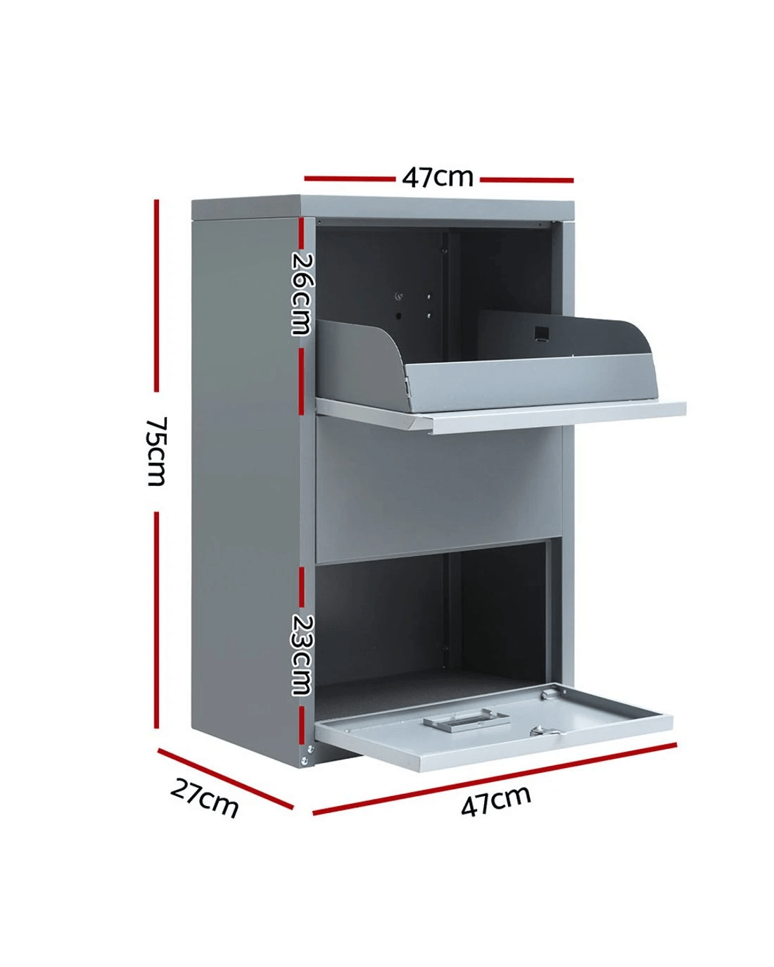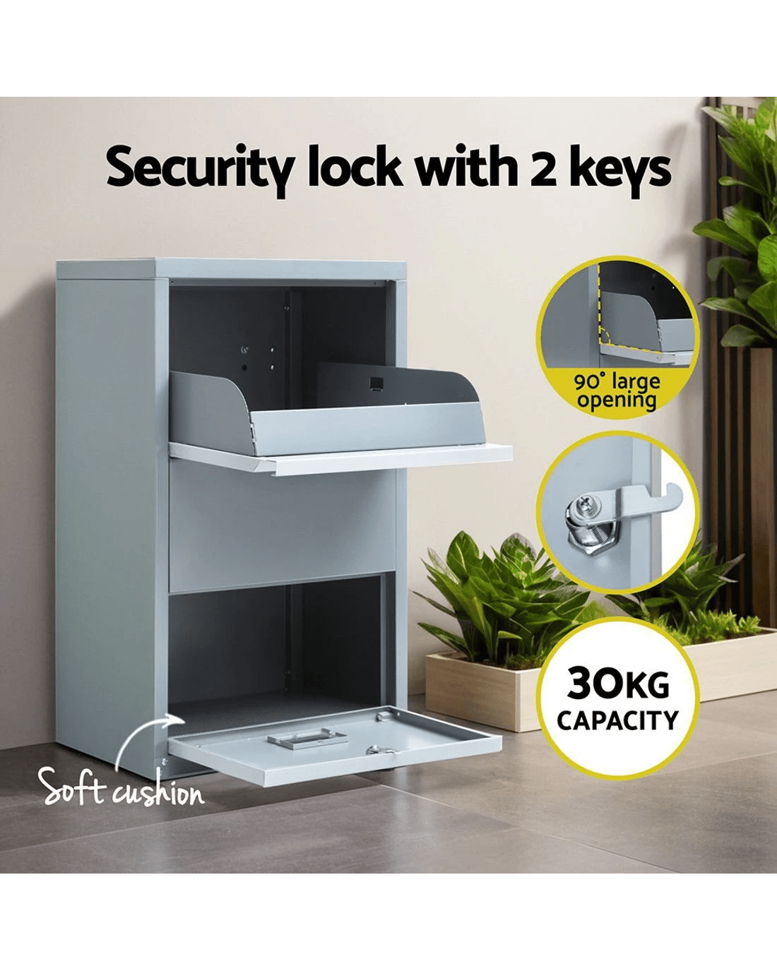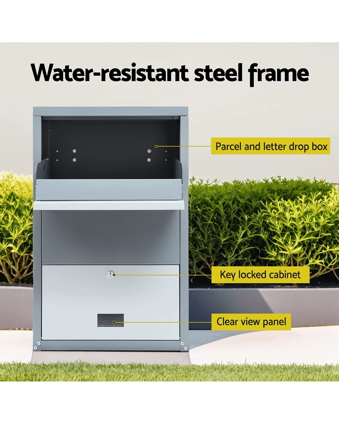 The Gardeon Parcel Drop Box offers a secure and convenient solution for receiving packages with its 2-way delivery system and water-resistant steel frame. Featuring a 90° large opening, locked cabinet, and clear view panel, this drop box ensures your parcels stay safe and dry.