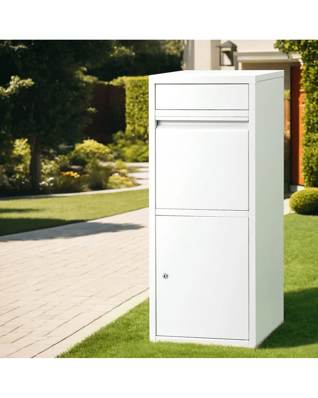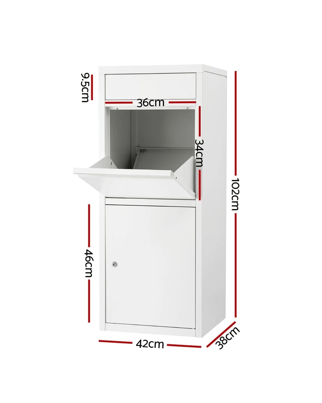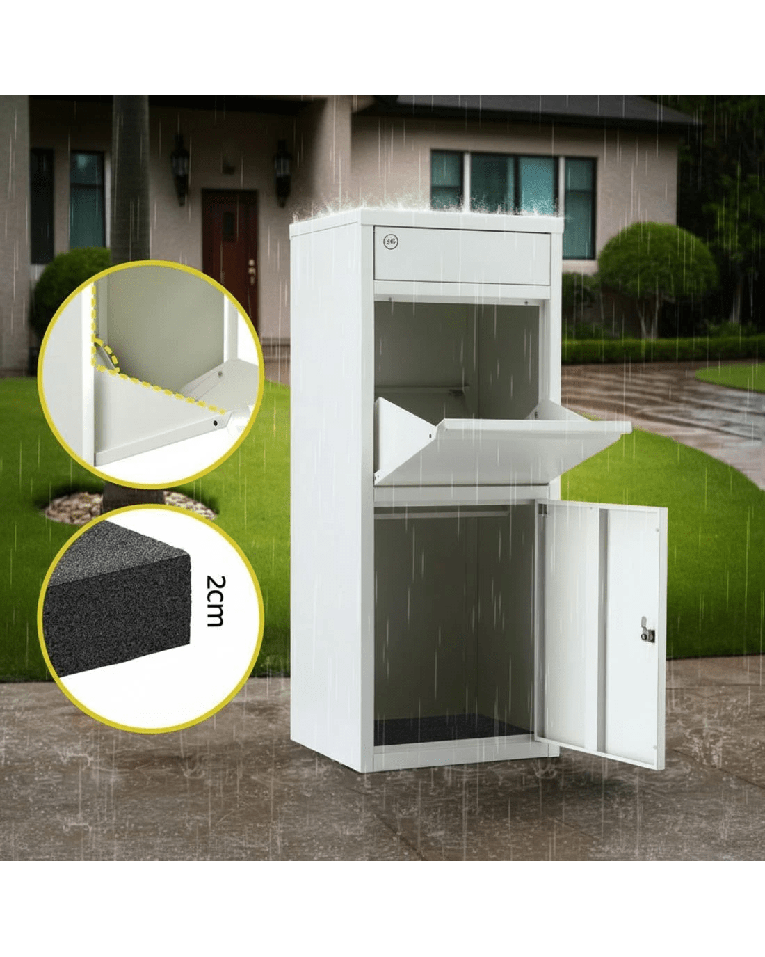 Heavy-duty weatherproof steel frame withstands Aussie elements. Features 2 slots drop design for mail + parcels with 90° large opening for bulky items. Secured locked cabinet includes 2 keys for safe collection. Large storage capacity with soft bottom cushion (2cm thick) protecting deliveries. Ideal for driveways or porches.