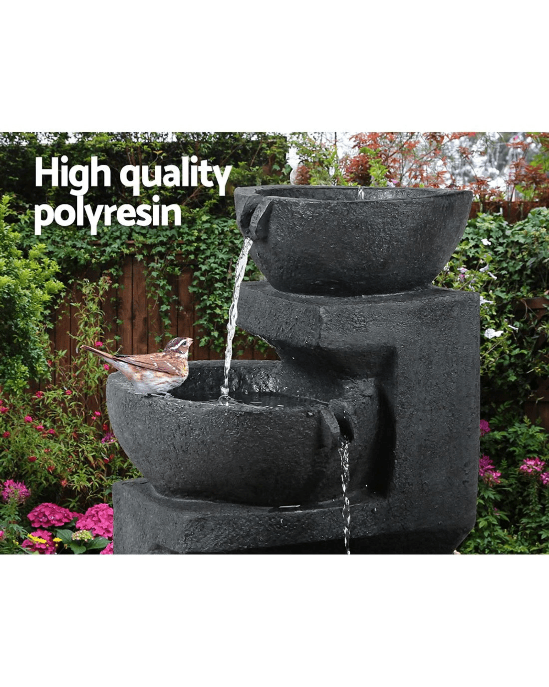 The Fountain features a 3-tier bird bath with water cascading down all the way. The 2W polycrystalline solar panel is weather proof and charges up a rechargeable lithium battery while the 0.8W water pump does its task efficiently with a flow rate of 200 litres/hr. However, do take note that the water pump is not designed to run dry as this will damage its internal components.