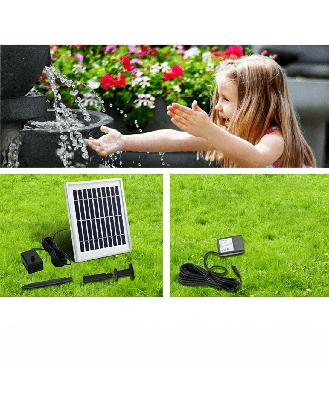 Comes with a set of solar panel w/ a rechargeable battery and water pump