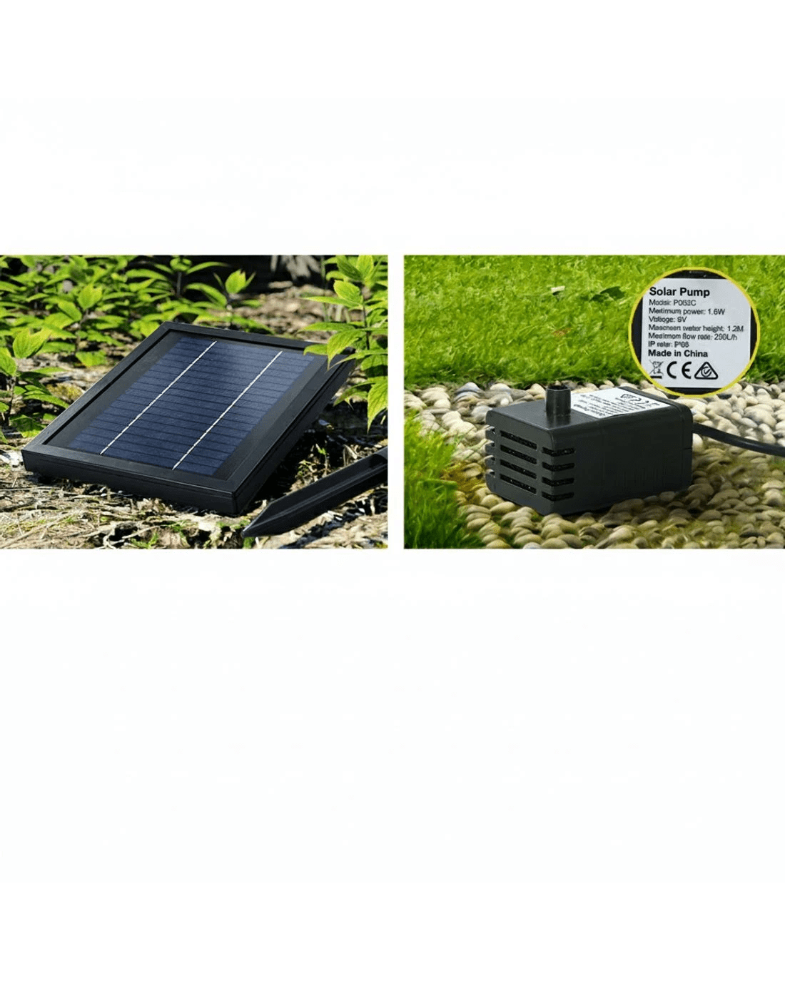 Solar panel, rechargeable battery, and water pump included