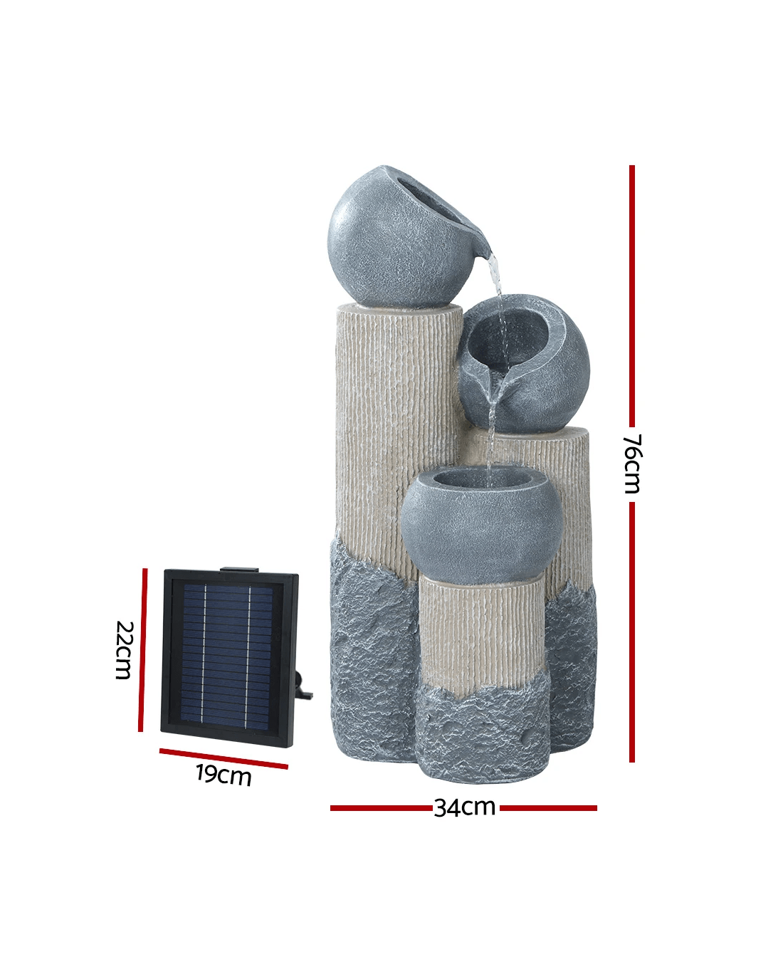 Upgrade the look of your space with the Gardeon classic and decorative solar fountain. You can style both indoors and outdoors. It makes a beautiful addition just anywhere. Our solar-powered fountain pump practically runs at zero costs as it draws its energy from the Sun, which makes it a cost-effective option. It features a decorative, cascading design that will blow your mind and WOW your guests. The gorgeous sculptural, fine details are noteworthy and will add a classic charm to your space. Made of quality polyresin, the fountain is durable, lightweight, and practically maintenance-free. It's installed with LED lights to add a bright and calming sparkle to its flow at night. Polycrystalline solar panels are energy-efficient and weatherproof. It comes with a built-in lithium battery and a powerful and durable water pump that efficiently does its job with a maximum flow rate of 250L/h. The solar panel and solar pump come with an IP rating of IP44 and IP68 to ensure your peace of mind. So, without hesitation, get this Gardeon stunning centrepiece solar fountain today!