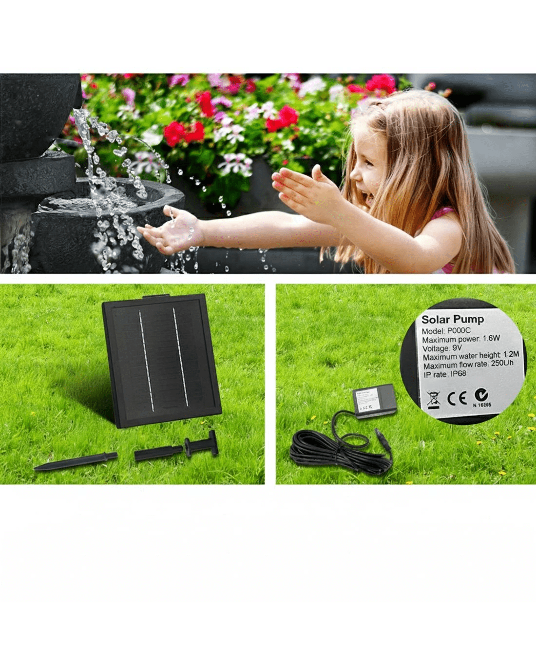 Comes with a set of solar panel w/ a rechargeable battery and water pump