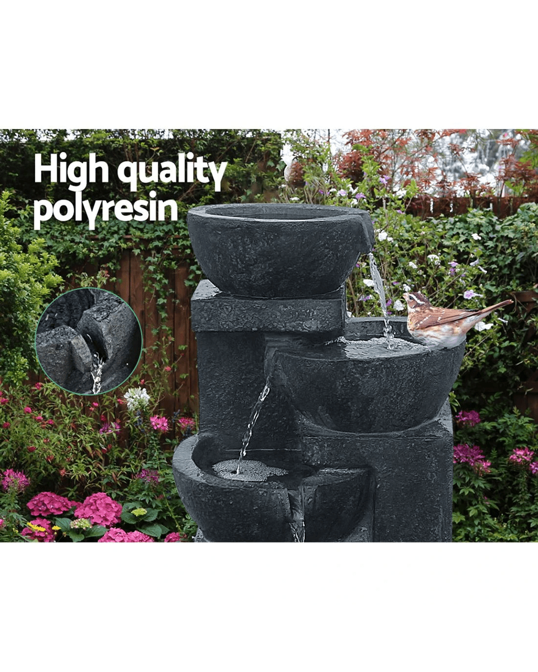 The Fountain features a 4-tier bird bath with water cascading down all the way. The 3W polycrystalline solar panel is weather proof and charges up a rechargeable lithium battery while the 1.6W water pump does its task efficiently with a flow rate of 250 litres/hr. However, do take note that the water pump is not designed to run dry as this will damage its internal components.