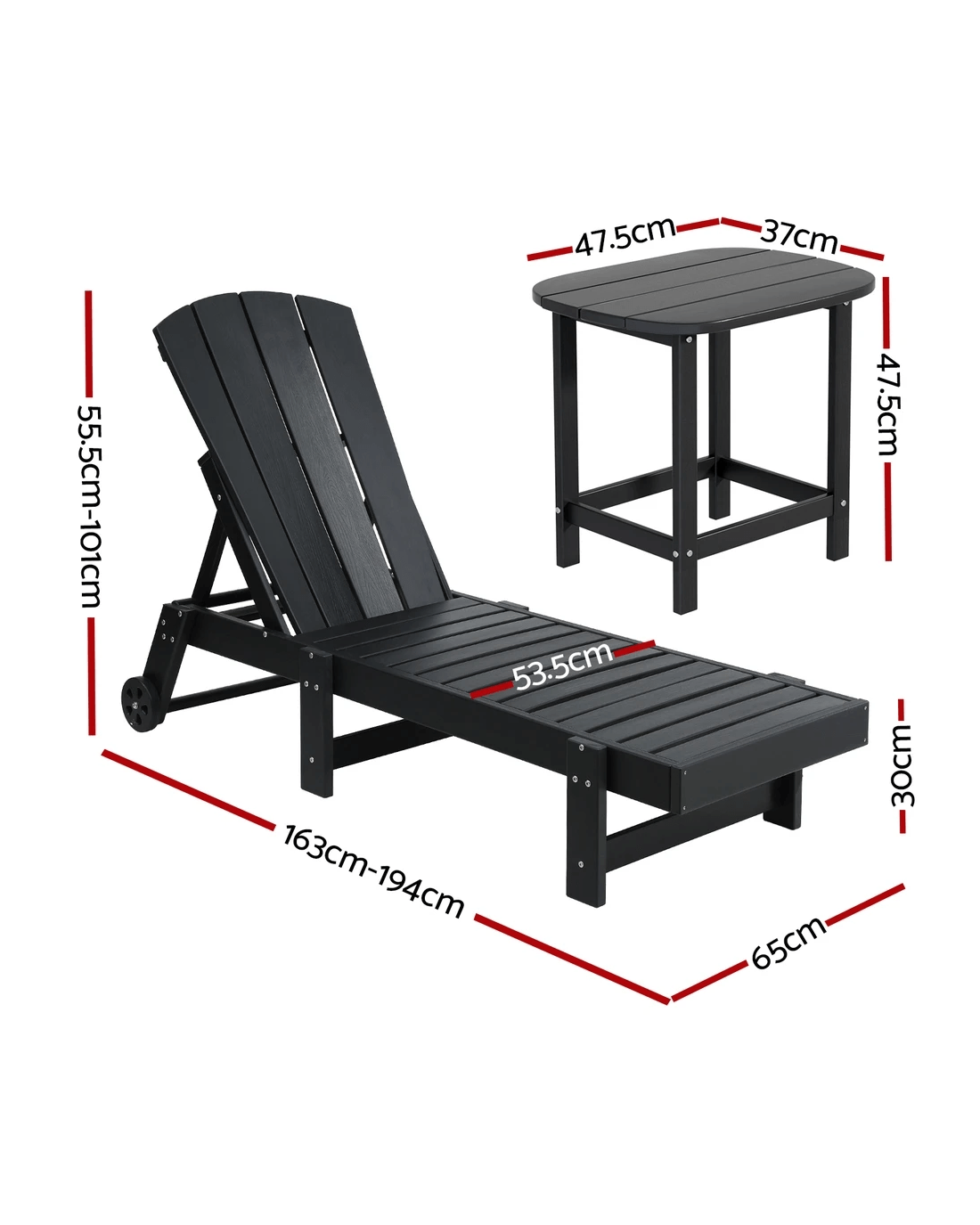 Sun lounge dimensions:163-194x 65 x 55.5-101cm (L x W x H)