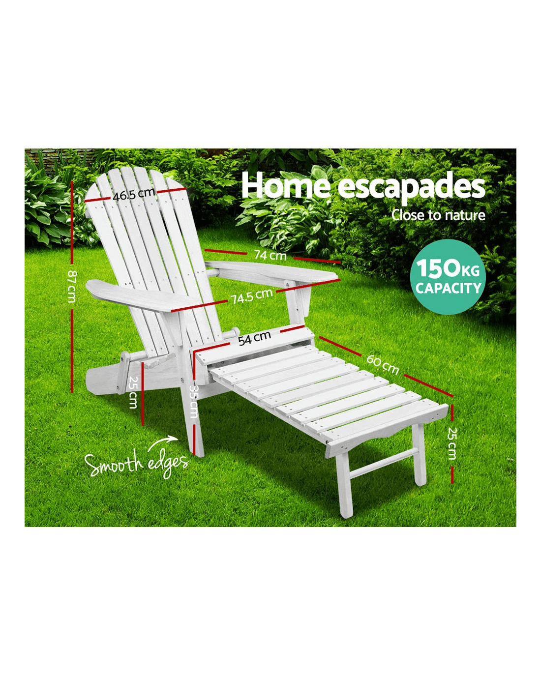 Our Adirondack Chair has followed the age-old tradition of producing a chair that is sturdy and longlasting, and retaining pertinent details such as the supportive high back, smooth edges, bevelled highlights, and flat, extra wide armrests. Not least, its 150kg weight capacity also ensures that it is strong and firm even with robust use. With meticulous attention to crafting details, the chair is finished in an eco-friendly water-based paint to preserve the Hemlock wood finish and improve its UV resistance and all-weather use capability. Better still, the chair is compatible for use with our slide-out ottoman to put your feet up for some mega relaxation. And when not in use, you have the option to fold the chairs away for safe keeping.