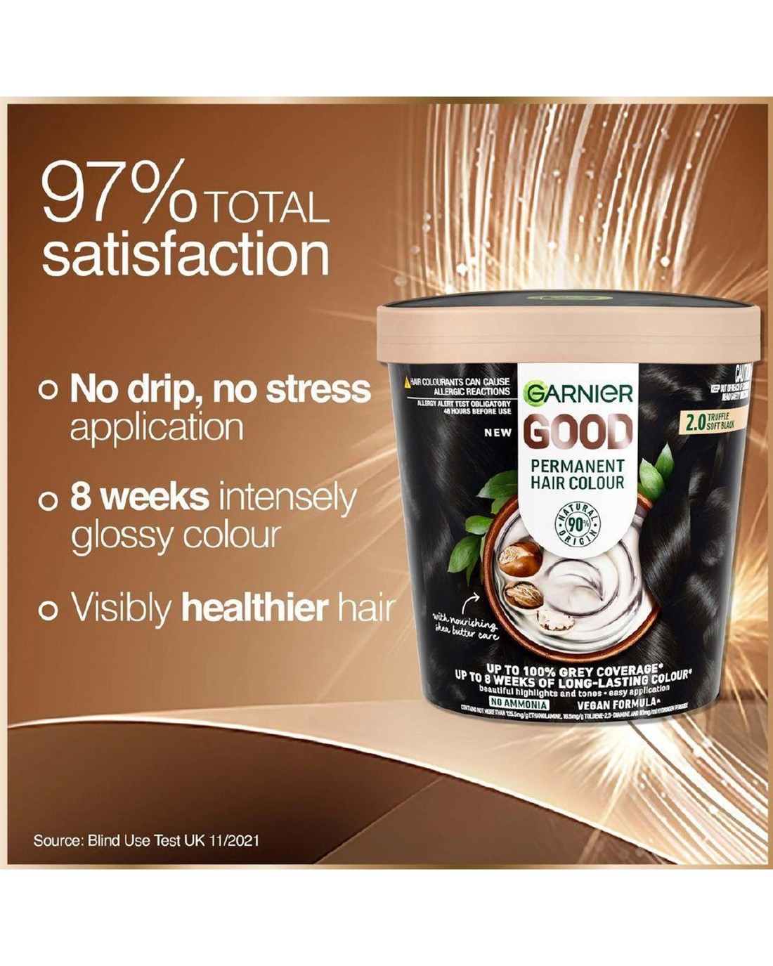 SummaryTransform your look with Garnier's Permanent Hair Colour in 2.0 Truffle Soft Black. This vegan formula is enriched with nourishing Shea Butter and offers up to 100% grey coverage. Enjoy a luxurious fragrance of sandalwood, goji berry, and orchid while achieving long-lasting, glossy colour. Free from ammonia, silicones, and alcohol, it's perfect for a stress-free, salon-like experience at home. Ideal for those seeking vibrant colour with natural ingredients.