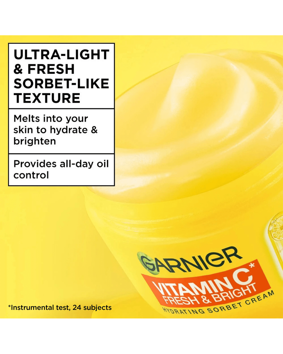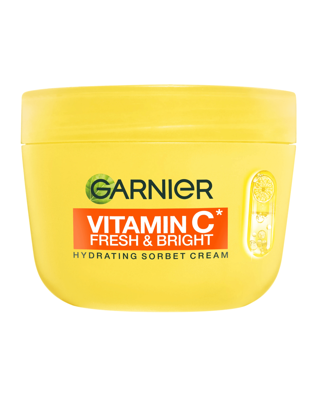 Experience the next generation of moisturiser with Garnier's Vitamin C* Fresh & Bright Hydrating Sorbet Cream, an ultra-light sorbet moisturiser that melts into your skin for 24-hour hydration. Designed to target dull and uneven skin tone with all day oil control, this non-greasy formula is your go-to for radiant, refreshed skin. Formulated with advanced bio‑technology, 4% Vitamin C* + Niacinamide penetrates deeply to even skin tone, brighten and nourish, improving overall skin clarity. With its unique blend of Vitamin C* + Niacinamide, this sorbet face cream delivers long-lasting hydration and leaves skin feeling soft. Suitable for all skin types, including sensitive skin. Tested under dermatological control. Ideal for dull, uneven skin that needs hydration. *Vitamin Cg = Vitamin C derivative.