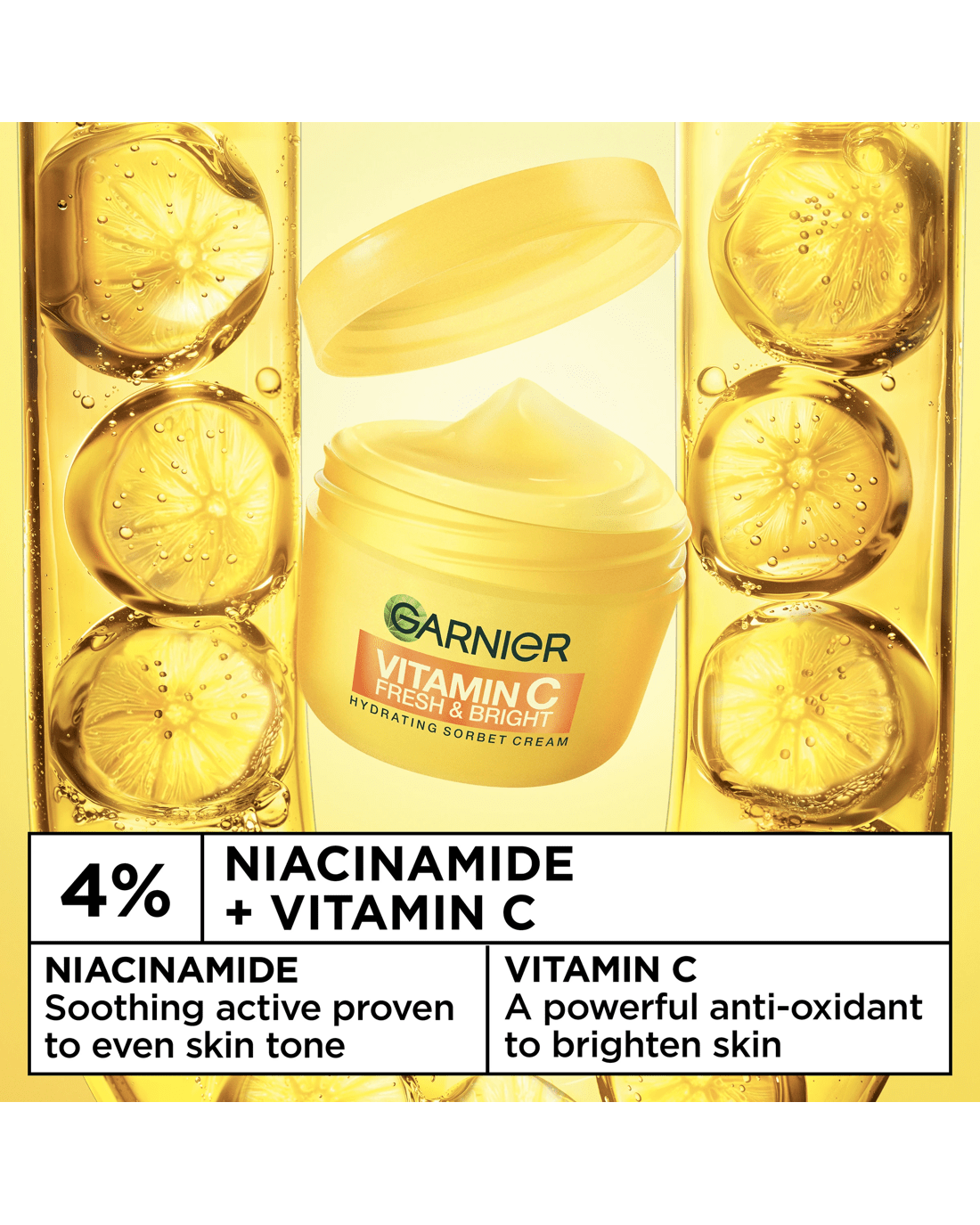 Experience the next generation of moisturiser with Garnier's Vitamin C* Fresh & Bright Hydrating Sorbet Cream, an ultra-light sorbet moisturiser that melts into your skin for 24-hour hydration. Designed to target dull and uneven skin tone with all day oil control, this non-greasy formula is your go-to for radiant, refreshed skin. Formulated with advanced bio‑technology, 4% Vitamin C* + Niacinamide penetrates deeply to even skin tone, brighten and nourish, improving overall skin clarity. With its unique blend of Vitamin C* + Niacinamide, this sorbet face cream delivers long-lasting hydration and leaves skin feeling soft. Suitable for all skin types, including sensitive skin. Tested under dermatological control. Ideal for dull, uneven skin that needs hydration. *Vitamin Cg = Vitamin C derivative.
