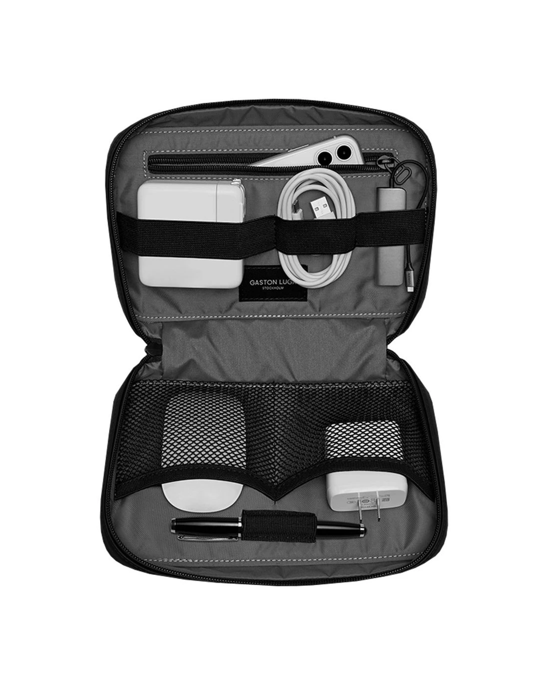 Crafted from GRS-certified recycled polyester with 20,000 mm waterproof rating, this tech organizer from Gaston Luga keeps chargers, cables, and accessories neatly in place. Multiple pockets, elastic straps, and compartments make it easy to stay organized. Plus, it’s compact and travel-friendly, fitting effortlessly into your bag or backpack.