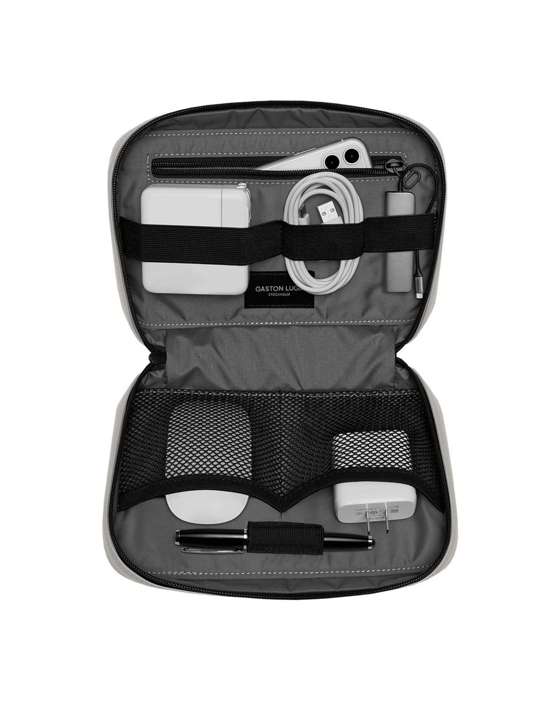 Crafted from GRS-certified recycled polyester with 20,000 mm waterproof rating, this tech organizer from Gaston Luga keeps chargers, cables, and accessories neatly in place. Multiple pockets, elastic straps, and compartments make it easy to stay organized. Plus, it’s compact and travel-friendly, fitting effortlessly into your bag or backpack.