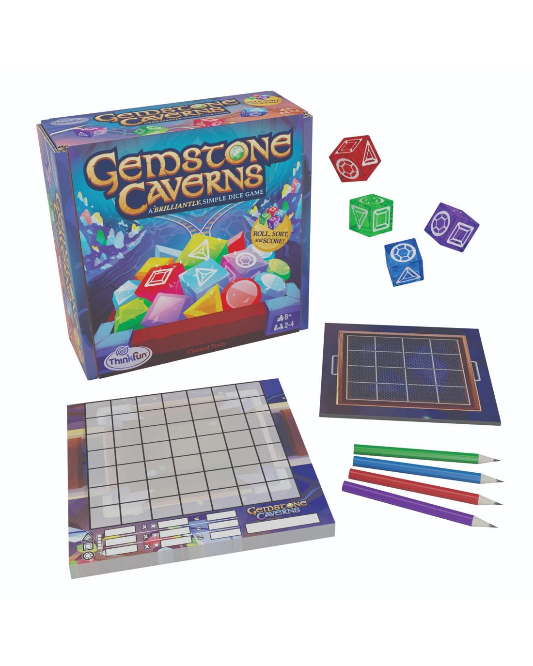 Bored of mundane board games and looking for something that sparkles? Introducing Gemstone Caverns by ThinkFun. The Gem Buyer wants groups of 5 or more gems and you are looking to make some profit! Roll for your riches as you drop the gemstone dice down the mine shaft. Set the the pattern on the sifter and all players record the pattern on their scoresheet carts. Flip and rotate the gems to get as many groups as you can to score big! Remember, the Gem Buyers want as many groups of 5 or more that they can purchase, so don't rely on one group of many gems. Roll, rotate, and maximize the value of your cart using logic and spatial recognition. Perfect for 2-4 Miners Searching for their Riches! Ages: 8 + | Players: 2 - 4 | Playtime: 25 - 50 min