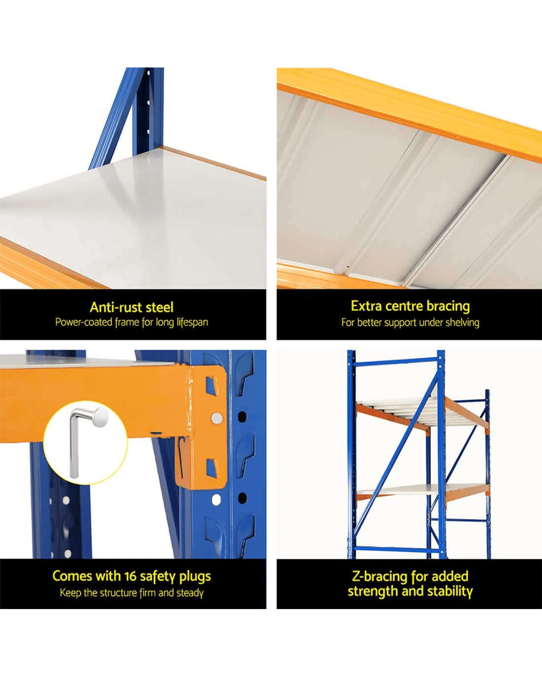 Looking for a heavy-duty shelving unit that does the work confidently and still looks modern and sturdy? Look no further than the Gardeon Warehouse Shelving Unit which can hold up to a massive 200kg per shelf. That's the equivalent weight of an average gorilla sitting on one shelf! Besides the gigantic weight capacity, Gardeon shelving units are built with industrial-strength steel with added Z-bracing to hold and keep the structure firm and steady when fully loaded. The anti-rust coating keeps the shelves sturdy and long-lasting. The unit is easy to assemble – simply use a rubber mallet to tap the frame into place. The shelves are easily height adjustable so you can create your ideal set-up. Comes with 16 safety plugs to keep the frame stable and steady.
