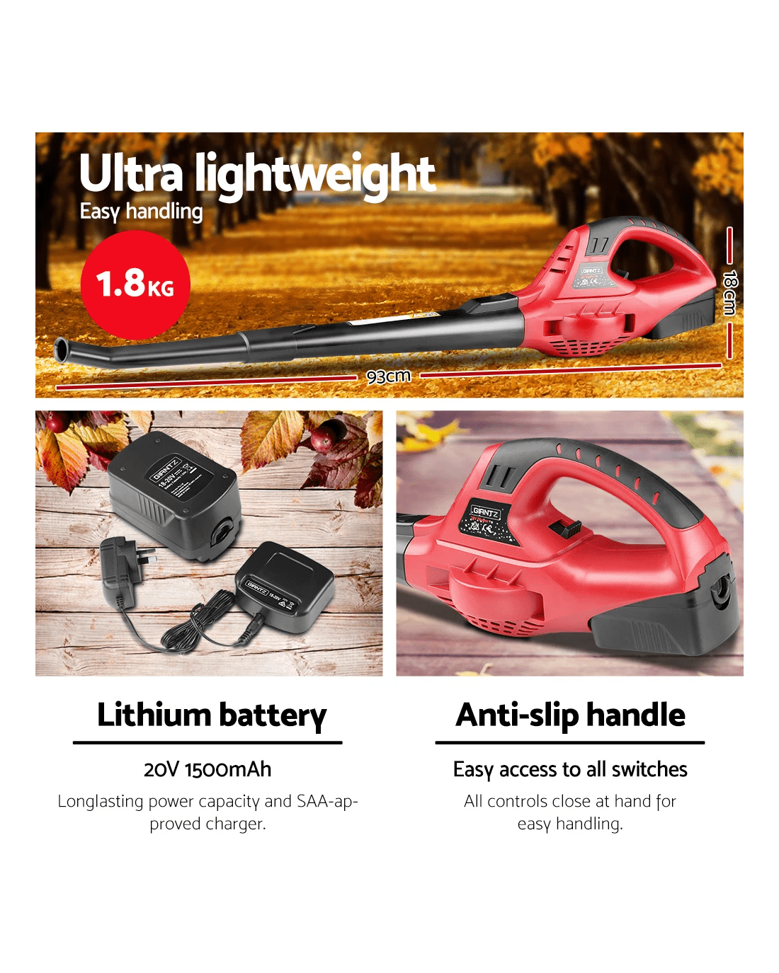 No fuss design. No mess. No fume. And no fuelling up. Powered by an 20V lithium-ion battery, the Giantz Cordless Blower helps you to clear up the messy outdoors without the usual hazards or hassles of a petrol-drive one.