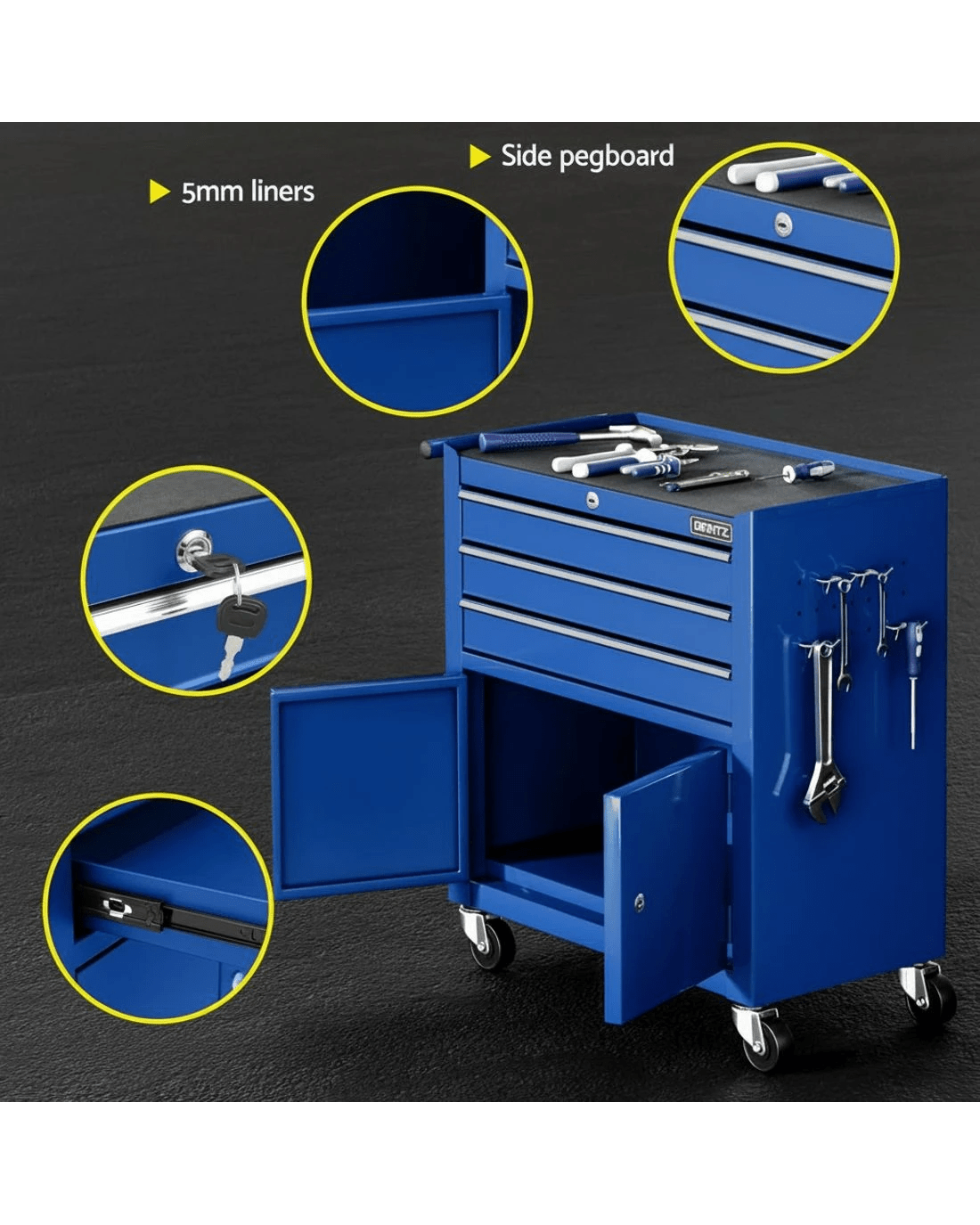This robust, multi-drawer Gardeon Tool Trolley is an essential for any workshop. Crafted from durable steel, it features smooth ball-bearing slides for easy access and a secure lock system for safety. Its spacious design accommodate tools of all shapes, complete with non-slip liners. The chest is also mounted on omni-directional castors with locakable front wheels, ensuring a smooth maneuverability and stable positioning. Sleek and functional, it's perfect for organizing and protecting your valuable tools.