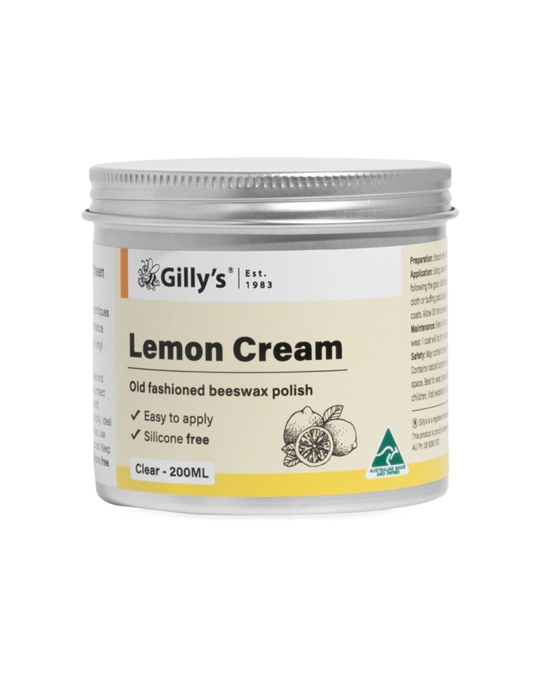 The Gillys Cream Lemon 200ml is a natural beeswax polish designed for nourishing and protecting timber furniture and surfaces. It is ideal for enhancing the appearance of wooden pieces, including antiques, and provides a beautiful high sheen finish. This versatile cream can also be used effectively on leather, vinyl, and linoleum floors, making it a practical choice for various household surfaces.