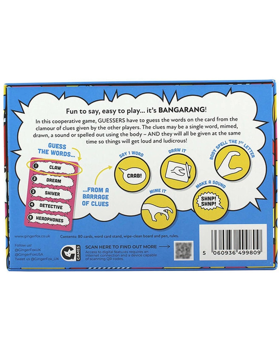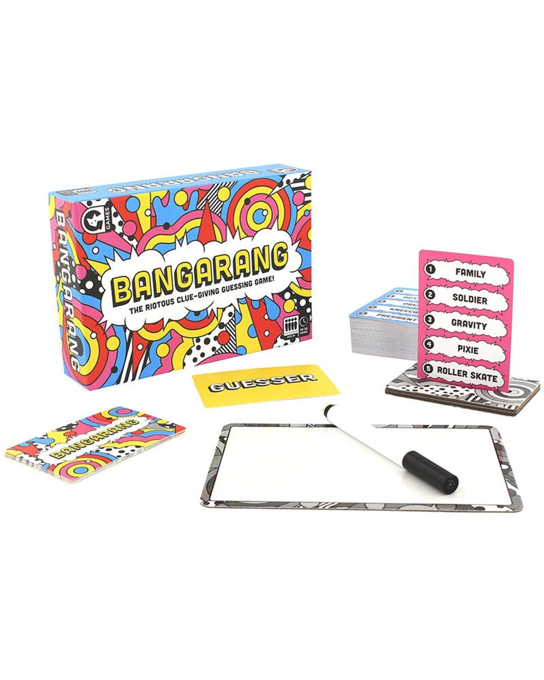 Charades meets pictionary in this frantic game. Get ready for a wild ride of laughter, creativity, and teamwork with BANGARANG, the fun family game that takes clue-giving to a whole new level! In this high-energy game, players join forces to help the guesser unravel the mystery word on the card using a variety of entertaining clues. BANGARANG features a dynamic twist on traditional clue-giving. Players must use their wits and creativity to communicate the secret word in five different ways: through a single word, a mime, a single sound, a drawing, or by crafting the letters with their bodies. It's a riot of diverse communication styles that keeps everyone on their toes and guarantees endless hours of fun. Ages: 8 + | Players: 4 + | Playtime: 20 - 30 min
