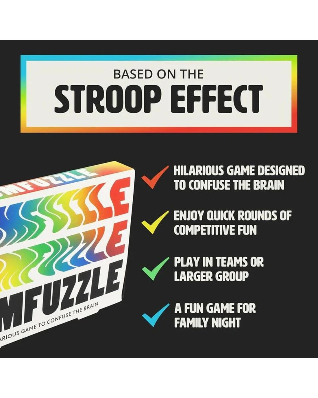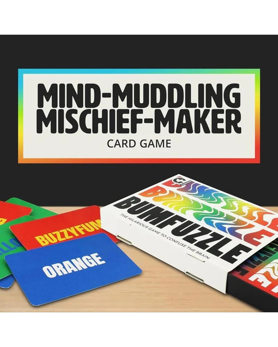 A mind-bending social card game in which players respond to a hysterically tricky combination of colours and words. No matter how quick-witted you think you are, this game will catch you out. The card in play determines what all players must do - say the colour of the word, read the word or stand up. Designed to bumfuzzle the brain. Ages: 12 + | Players: 2 + | Playtime: 15 - 20 Mins