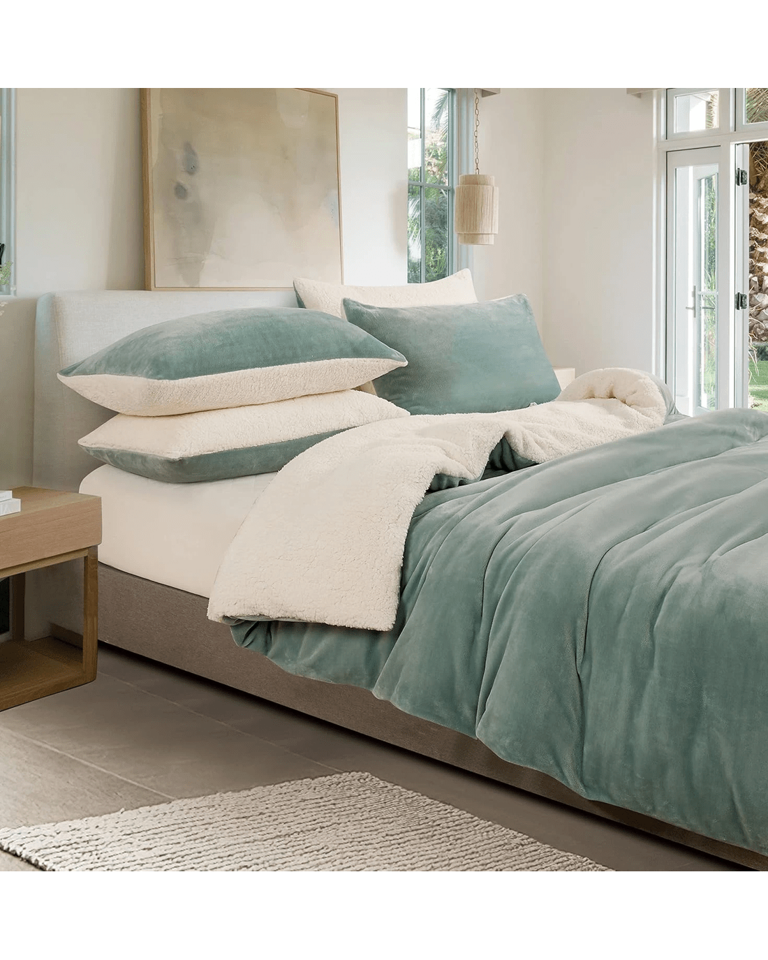 GIOIA CASA 2-in-1 Teddy Sherpa Quilt Cover Set & Blanket, Sage Green — Reversible 100% Microfibre (King) - Green