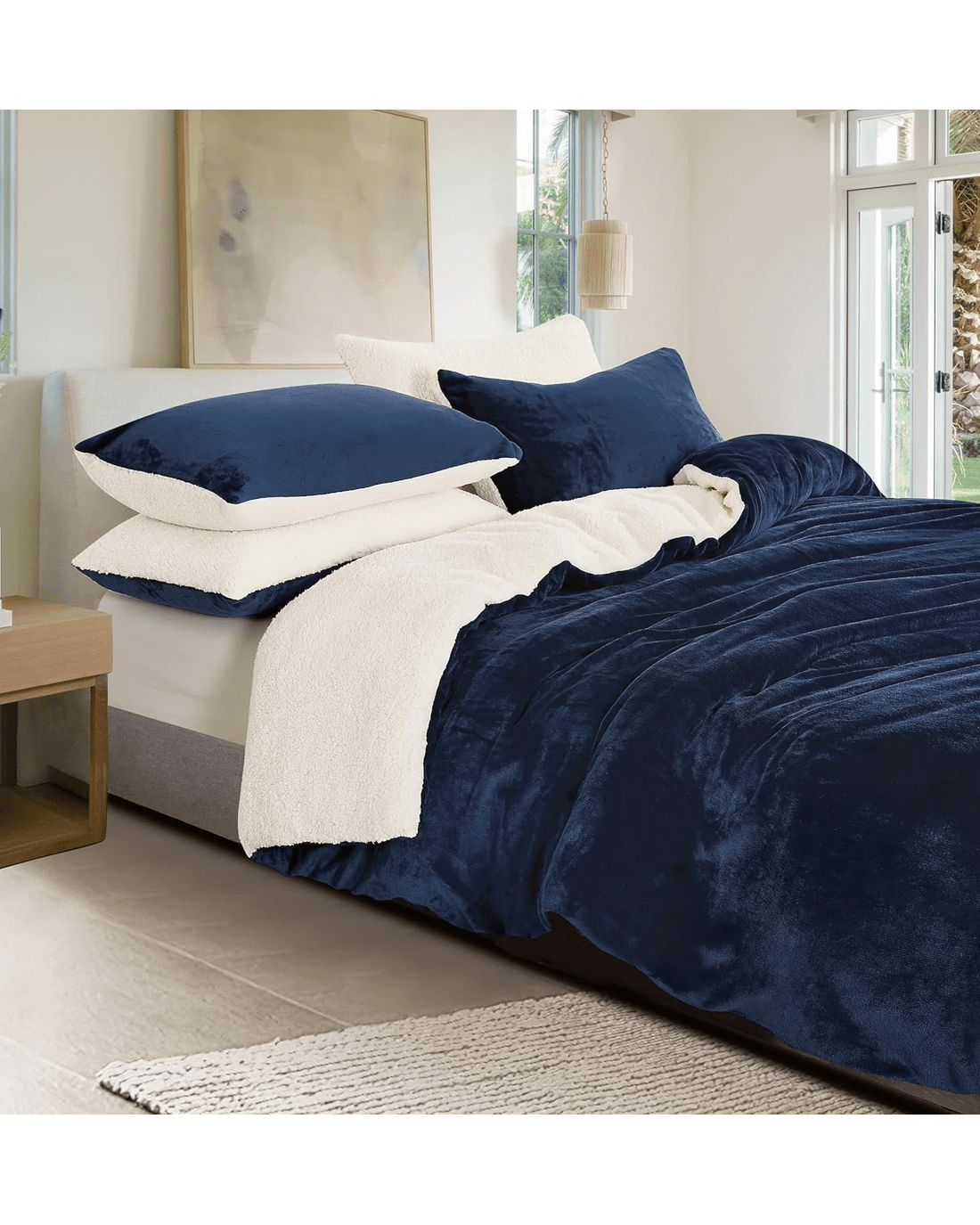 • 𝗣𝗿𝗲𝗺𝗶𝘂𝗺 𝗣𝗹𝘂𝘀𝗵 𝗙𝗮𝗯𝗿𝗶𝗰: Made from a luxurious combination of microplush velvet and teddy sherpa microfibre, this 2-in-1 quilt cover set delivers exceptional softness, warmth, and a cozy bedroom finish.