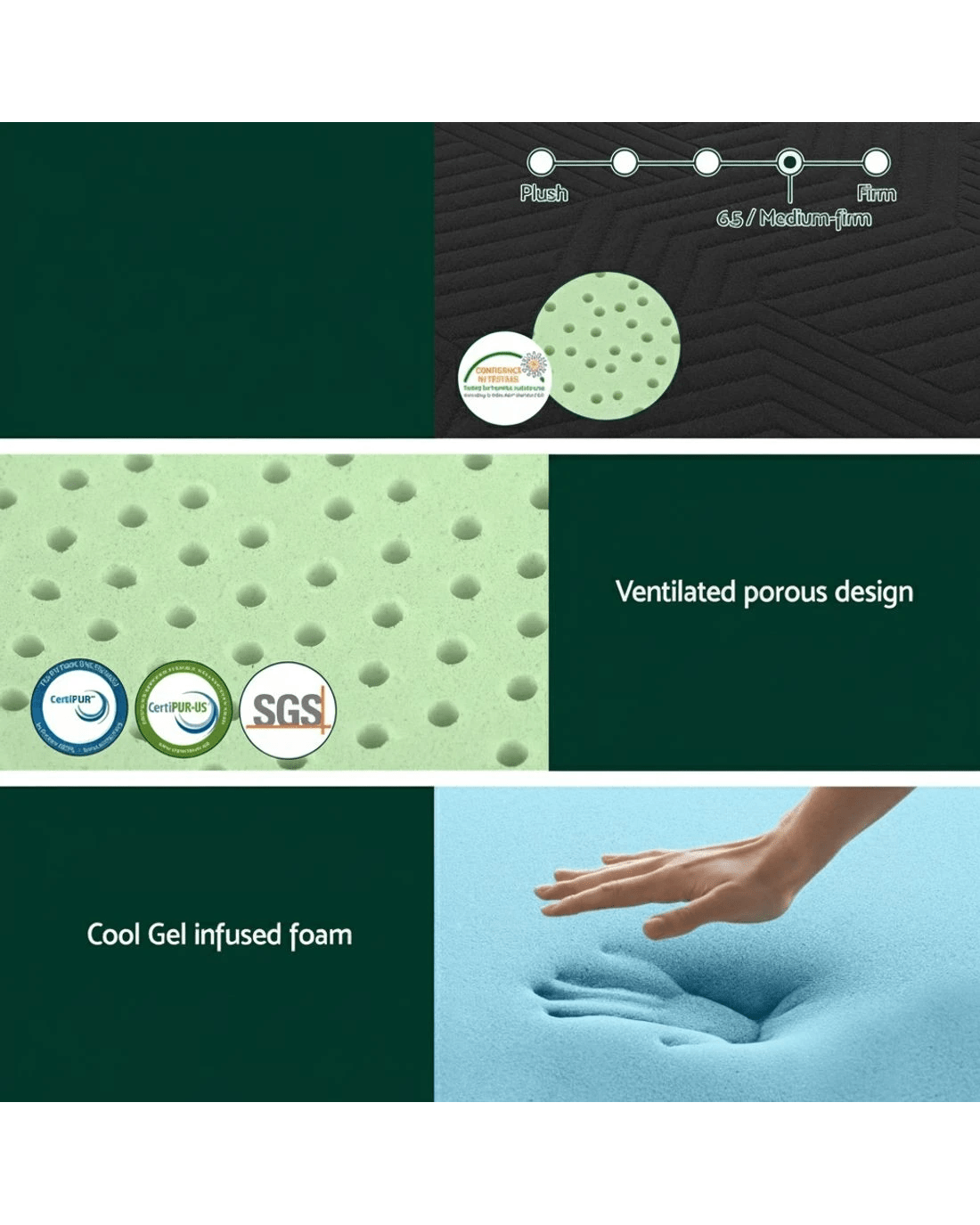 Foam Material: Cooling gel-infused foam, Green tea memory foam