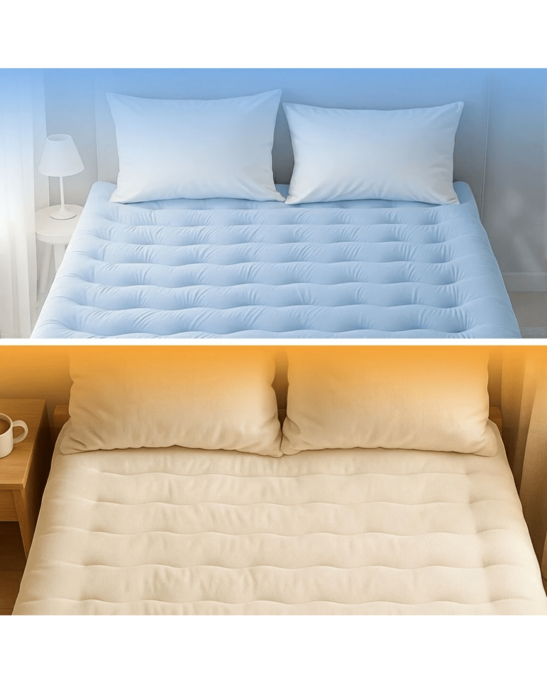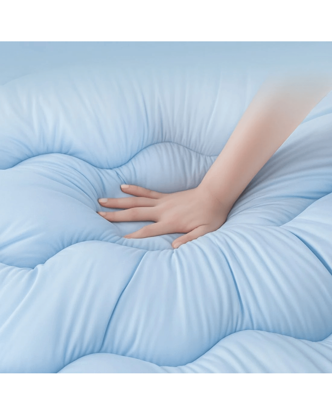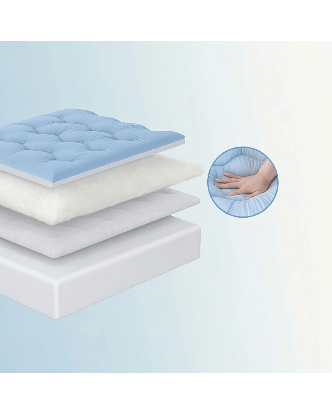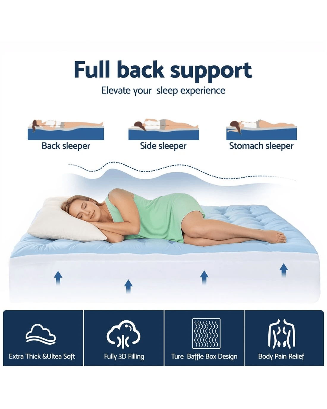 Enhance your sleep with Giselle Bedding's 5cm pillowtop topper featuring innovative double-sided design. The cooling fabric side wicks moisture while the coral fleece provides plush warmth.1000GSM hollow fiber filling and 3D wave quilting create balanced support that fits mattresses up to 45cm deep. This highly breathable topper reduces heat buildup and comes vacuum-packed for hygiene. Machine washable for effortless maintenance.