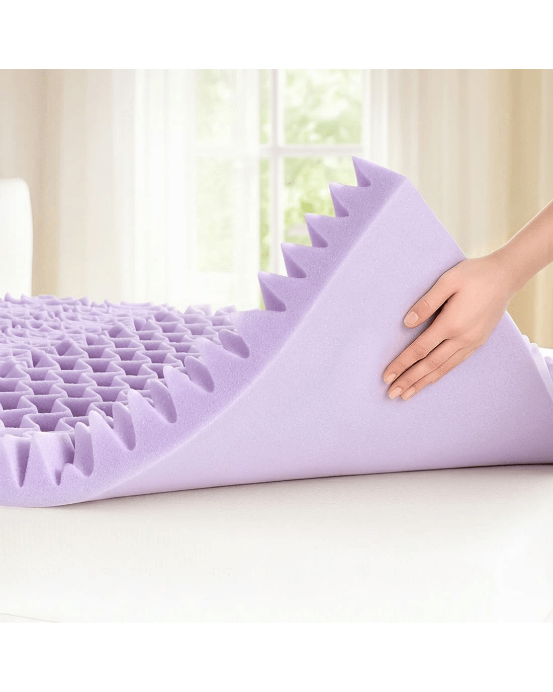 The innovative egg crate-style structure enhances airflow while providing over 1000 support points for even body weight distribution and reduced motion transfer—ideal for undisturbed rest. Covered in a soft, breathable bamboo fabric with a removable and washable zipper cover, it combines comfort with easy care.