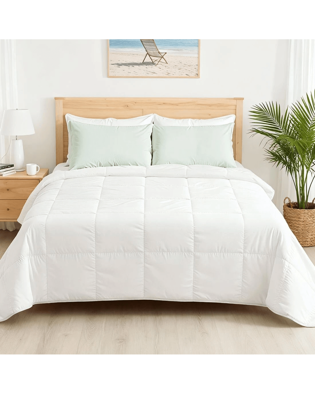 Experience cool comfort tailored for the Australian climate with this Giselle Bedding bamboo fiber summer quilt. The 200gsm bamboo and microfibre filling is highly breathable and thermo-regulating, actively working to moisture-wick and keep you naturally dry. The baffle box design keeps the filling lofty within the soft microfibre cover, ensuring sustained comfort and mould-resistant freshness. Conveniently vacuum packed for easy setup, this quilt is perfect for versatile use across your home.