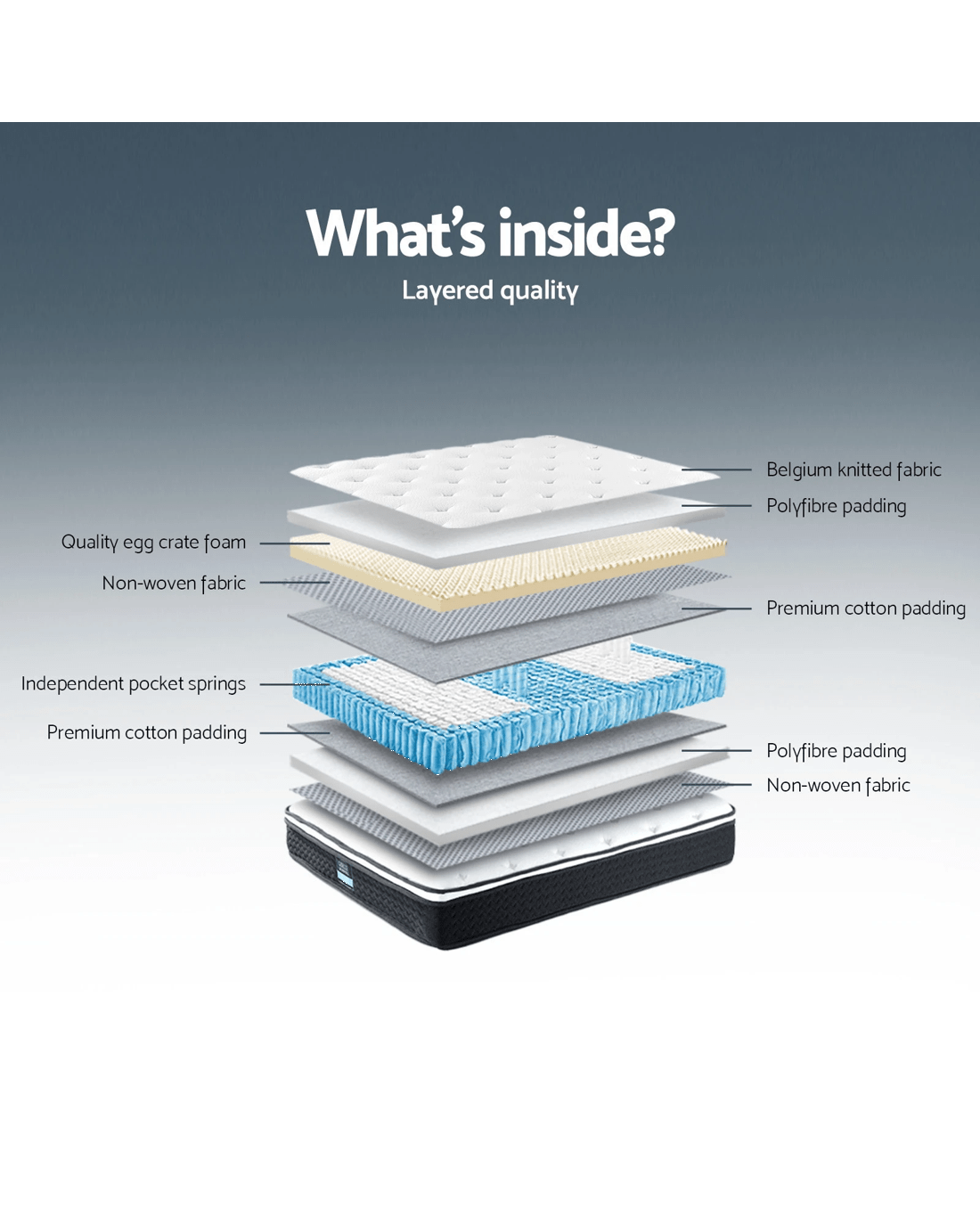 Unlike a pocket spring system, a Bonnell spring system uses springs that are hour-glass shaped rather than all of the same diameter. The result is a somewhat firmer mattress than a pocket spring version. The benefits include better support for your body, more resilience and better ventilation. Our mattress delivers all of the above with a level of comfort that surpasses your expectations. The mattress is meticulously constructed with layers of premium materials. A high density foam fills the inside of the mattress in between the stable Bonnell spring core while the exterior is fully wrapped with a luxurious polyester fabric. Not least, a soft quilting layer rests on top of the entire ensemble. Essentially, you get a solid mattress that retain its shape well for longlasting use and yet supple and comfortable to enjoy all its inherent benefits for you. As with all of our quality mattresses, the mattress is allergy-free and treated for dust and mould resistance. Available in Single, King Single, Double, Queen and King sizes.
