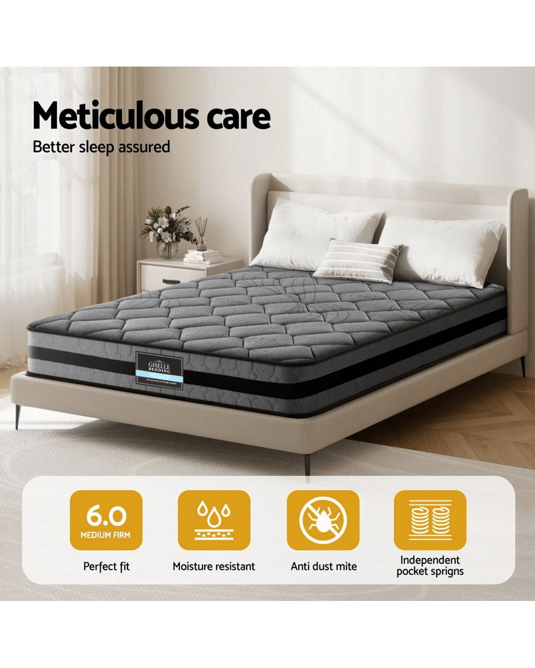 Pamper yourself with our Giselle Bedding Wendell Series Pocket Spring Mattress that will give you a soothing sleep night after night. Built upon layer upon layer of quality materials, the 22cm thick mattress is a testament to fine craftsmanship and innovative sleep technology. You will find everything you desire for a mattress. Ultra-comfort with its soft and smooth Belgium knitted fabric. Comprehensive support from its innovative 5-zone EvenZon pocket spring system with zero partner disturbance. And a medium firmness that many Australians love. At the core of the mattress lies independent 6-coil pocket springs, enveloped by high-density egg-shaped foam with a soft quilting layer resting atop. Not least, the mattress is hygienically constructed to free your body from allergens and dust mites. Better sleep is not just a dream. It is a reality with our luxurious pocket spring mattress.