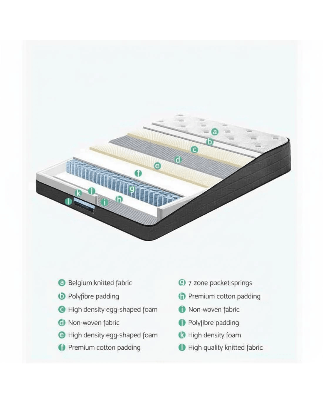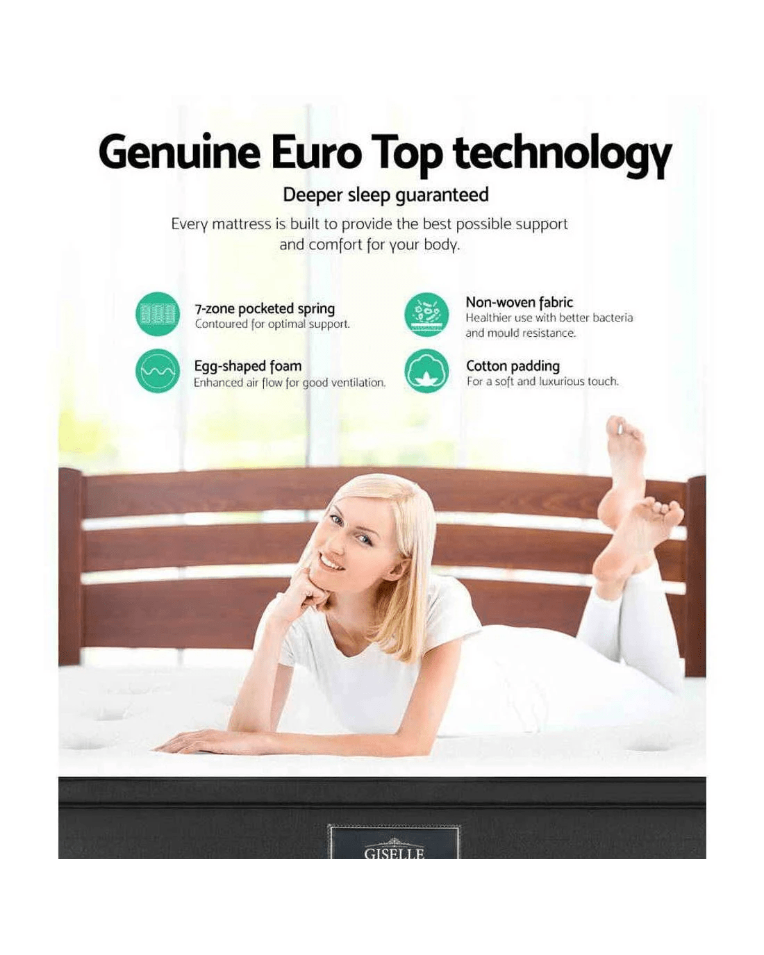 Pamper yourself with the Giselle Bedding Eve Series Euro Top mattress that will give you a soothing sleep night after night. Built upon layer upon layer of quality materials, the 34cm thick mattress is a testament to fine craftsmanship and innovative sleep technology. You will find everything you desire for a mattress. Ultra comfort with its soft and smooth Belgium knitted fabric and high-density egg-shaped foam padding and comprehensive support from its genuine 7-zone independent pocket springs system with zero partner disturbance and a firmness that is just right. Not least, the mattress is hygienically constructed to free your body from allergens and dust mites. Better sleep is not just a dream. It is a reality with our luxurious Euro Top mattress.