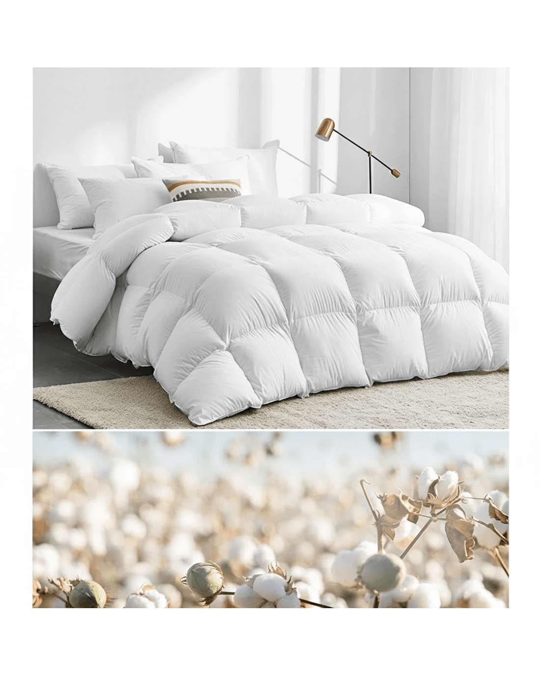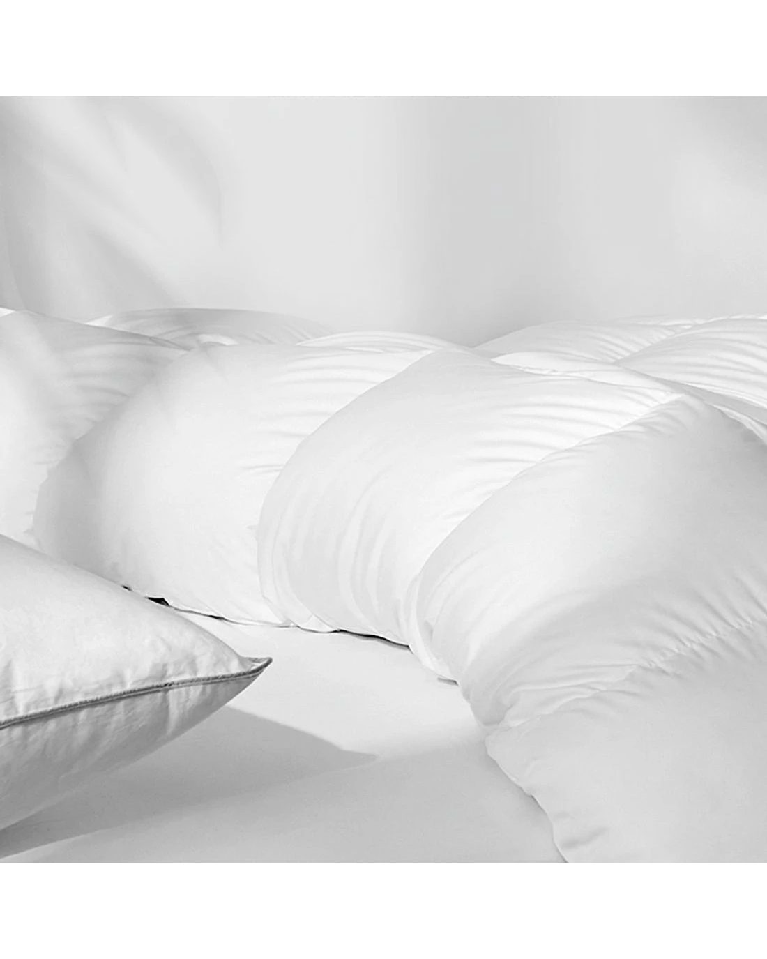 Filled with goose down feathers with 700gsm weight, the Quilt embodies a baffle construction that prevents shifting of the filling and helps to expand the down to retain heat, providing optimal warmth. The goose down feathers are lightweight and provide true warmth without added weight. Plus, the Quilt is mite and mould-resistant and easy to maintain. Not least, the cover itself is 100% pure cotton with a 233 thread count for exceptional quality.