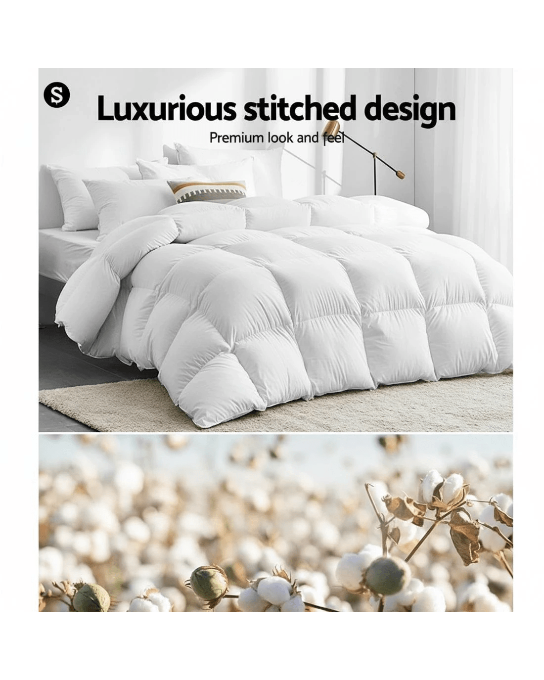 Indulge in luxury comfort with our finely constructed Giselle Bedding Goose Down Feather Quilt. It is the perfect quilt to provide you with seasonal comfort and a great feeling at all times. Filled with goose down feathers with 800gsm weight, the quilt embodies a baffle construction that prevents shifting of the filling and helps to expand the down to retain heat, providing optimal warmth. The goose down feathers are lightweight and provide true warmth without added weight. Plus, the quilt is mite and mould-resistant and easy to maintain. Not least, the cover itself is 100% pure cotton with a 233 thread count for exceptional quality.