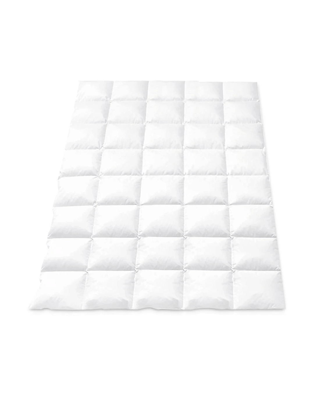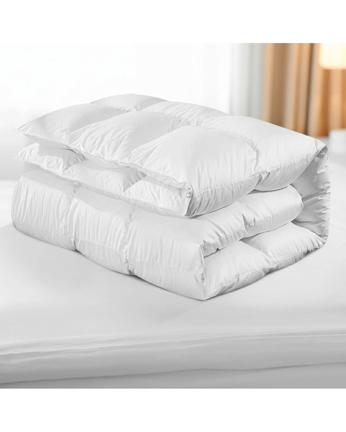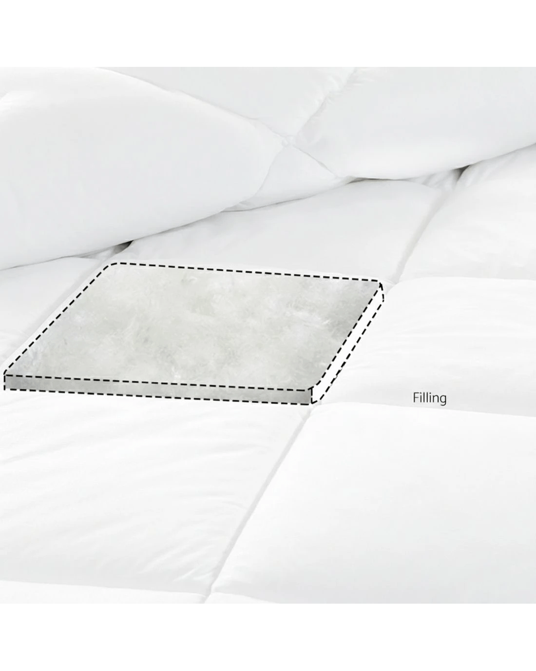 Indulge in luxury comfort with our finely constructed Giselle Bedding Goose Down Feather Quilt. It is the perfect quilt to provide you with seasonal comfort and a great feeling at all times. Filled with goose down feathers with 800gsm weight, the quilt embodies a baffle construction that prevents shifting of the filling and helps to expand the down to retain heat, providing optimal warmth. The goose down feathers are lightweight and provide true warmth without added weight. Plus, the quilt is mite and mould-resistant and easy to maintain. Not least, the cover itself is 100% pure cotton with a 233 thread count for exceptional quality.