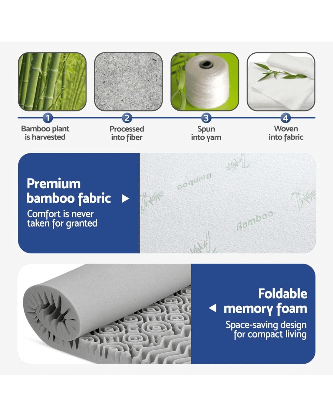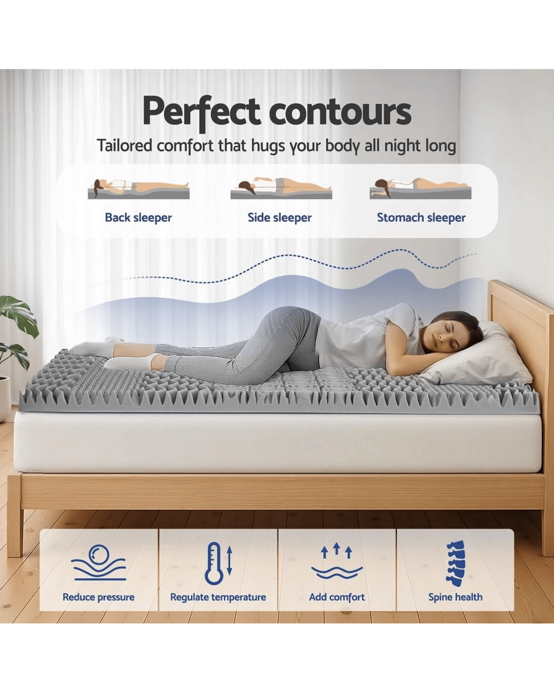 Experience elevated comfort with Giselle Bedding's 8cm graphite-infused memory foam mattress topper. Its 7-zone contoured surface with open cell structure improves airflow, while the memory foam offers lasting support and over 1000 contact points. Finished with a removable bamboo fabric cover and anti-skid base