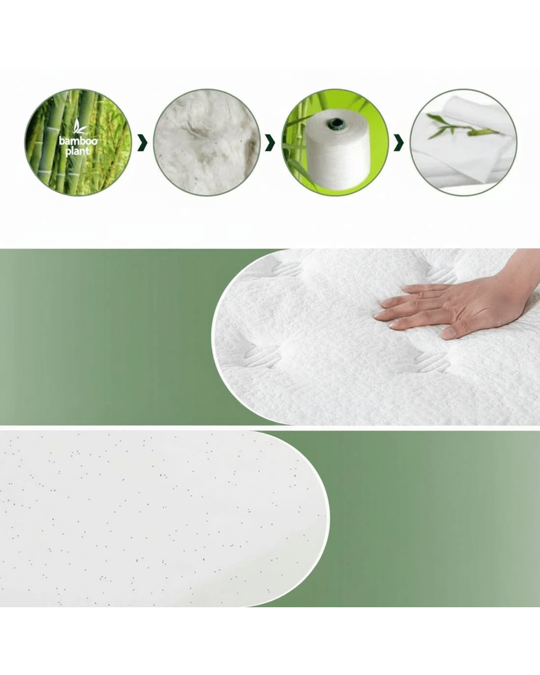 The Giselle Bedding Mint Series Mattress combines natural freshness with responsive support. Green tea foam helps maintain a fresher sleep environment, while the Euro Top layer cushions pressure points. Its 20cm profile features high-compression pocket springs and 6-turn coils that adapt to your body shape without losing firmness. Reinforced edges provide stable sleeping space, and the breathable bamboo fabric cover promotes airflow for temperature control. Available in 5 sizes (Single to King), it's engineered for lasting comfort in warm climates.