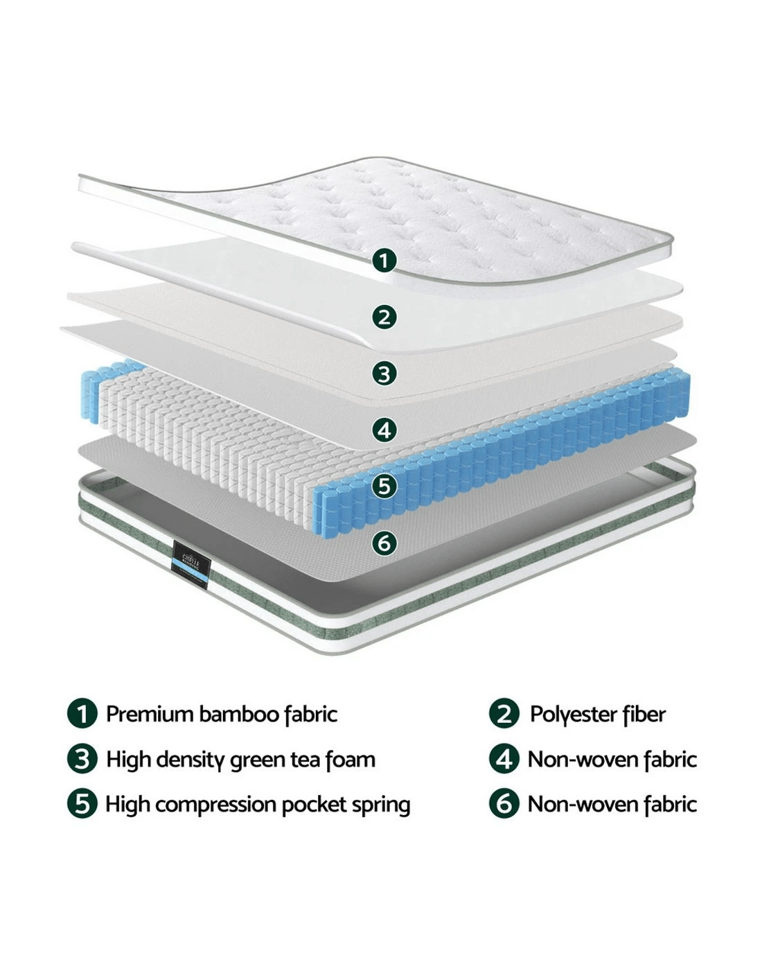The Giselle Bedding Mint Series Mattress combines natural freshness with responsive support. Green tea foam helps maintain a fresher sleep environment, while the Euro Top layer cushions pressure points. Its 20cm profile features high-compression pocket springs and 6-turn coils that adapt to your body shape without losing firmness. Reinforced edges provide stable sleeping space, and the breathable bamboo fabric cover promotes airflow for temperature control. Available in 5 sizes (Single to King), it's engineered for lasting comfort in warm climates.