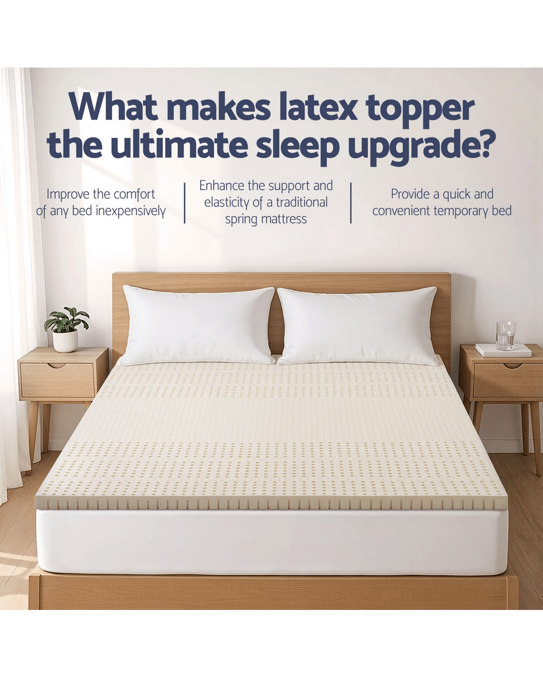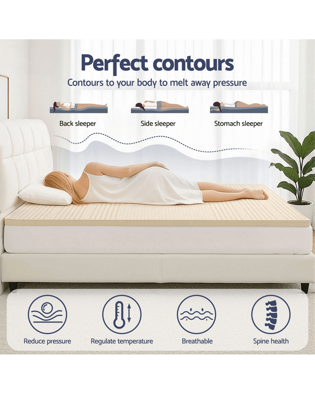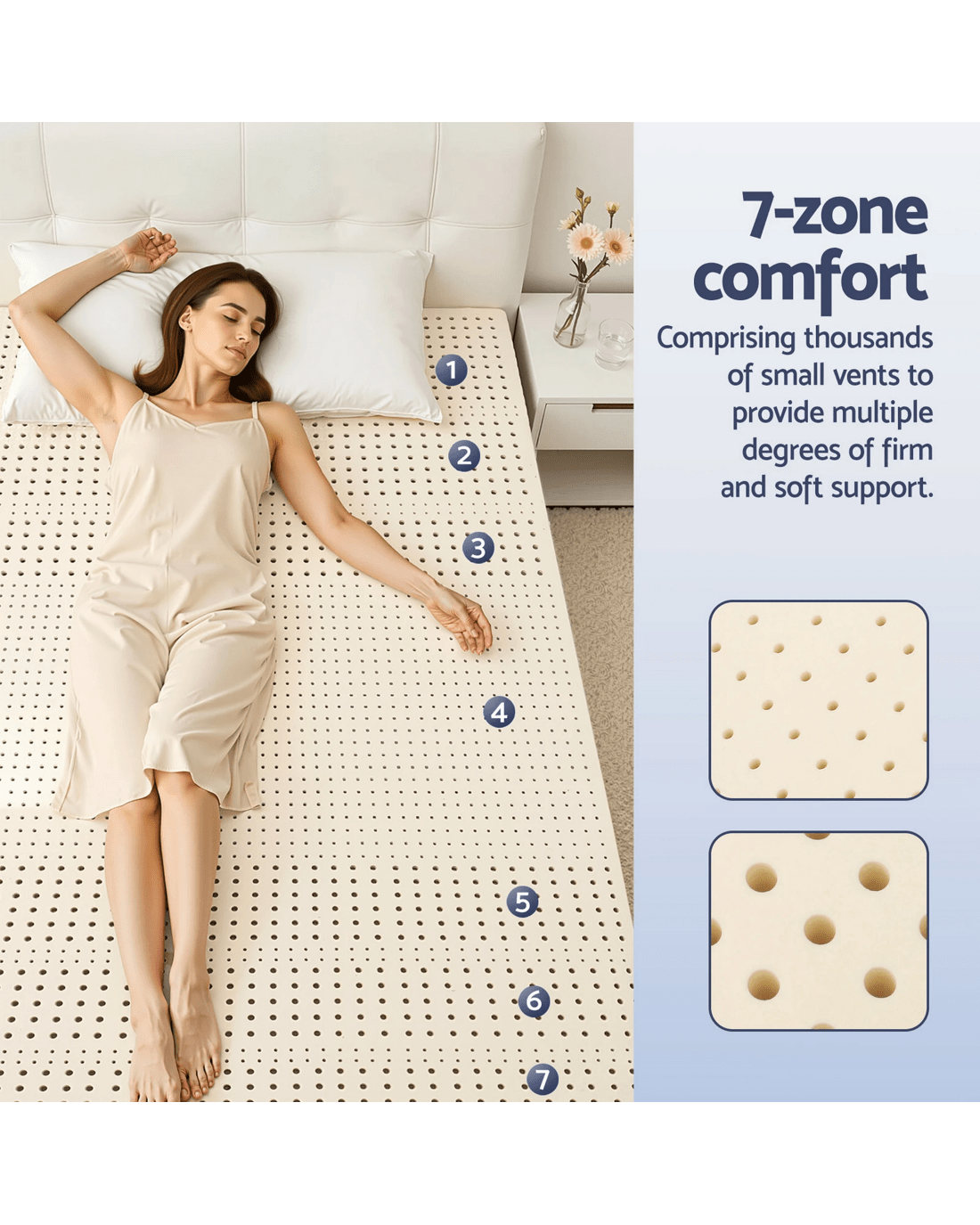 Upgrade your sleep instantly with the Giselle Bedding Natural Latex Topper. Its high-density latex features 7-zone comfort, providing total body support for optimal spinal alignment and motion isolation. The advanced cool-touch fabric cover and millions of air-cells ensure the topper is highly breathable and regulates temperature for a fresher sleep. With a removable cover and anti-slip bottom, this topper guarantees a cool, stable, and truly restorative night's rest.