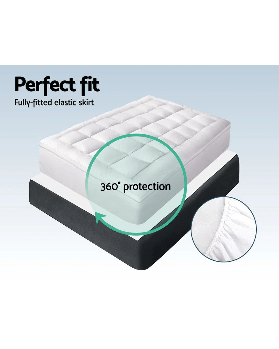 Featuring 1000gsm bamboo ball fibre filling housed in a microfiber polyester fabric cover, our 5cm thick topper is overly generous with softness and comfort. The topper actually comprises several pockets that are neatly sewn together to ensure that the filling does not spread and go lumpy. Plus, the fully-fitted 45cm elastic skirt around the topper also ensures that the topper stays in place at all times.