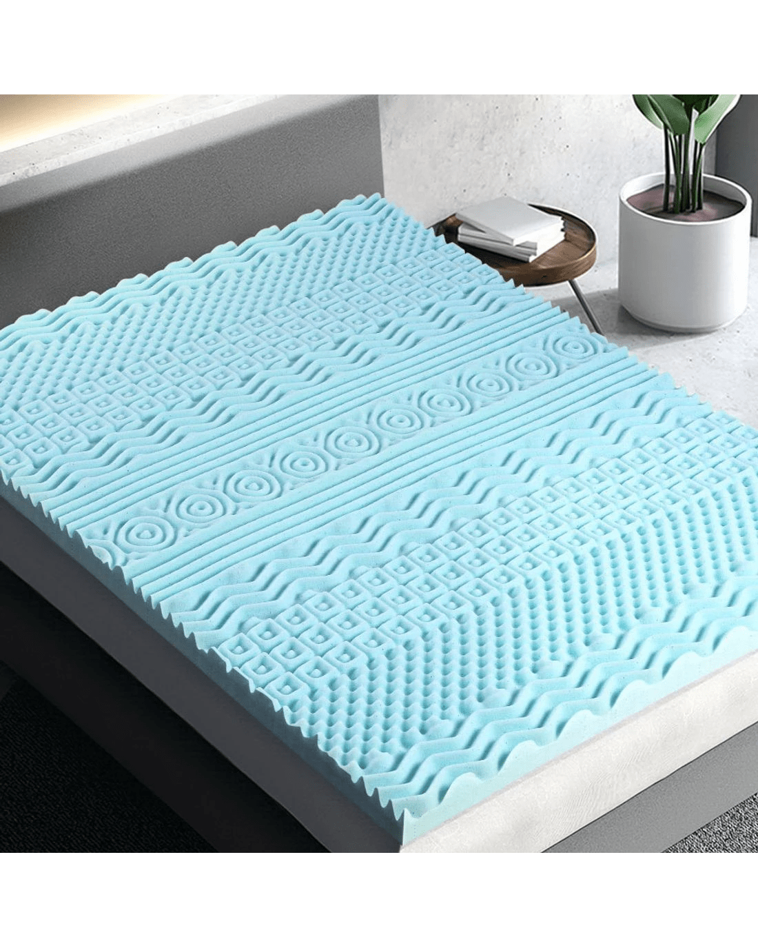 You don't have to change your mattress; our mattress topper is the solution. Our memory foam mattress topper provides additional comfort and more targeted support while sleeping. With our upgraded 11-zone layouts, total body support and more therapeutic and restful sleep is guaranteed. It contours your body's curves and cradles and keeps your body aligned. Plus, it controls motion transfer, ensuring that you will not be disturbed by any tossing or turning motion, and relieves pressure, reducing body aches. The cool gel technology helps maintain the right temperature to sleep and allows air circulation to keep you cool. Our memory foam mattress topper is perfect for those suffering from neck pain, chronic back pain, or joint pain and is ideal for all types of sleepers. Not least, it prevents you from developing any allergies as it is resistant to dust mites, mould and mildew growth.