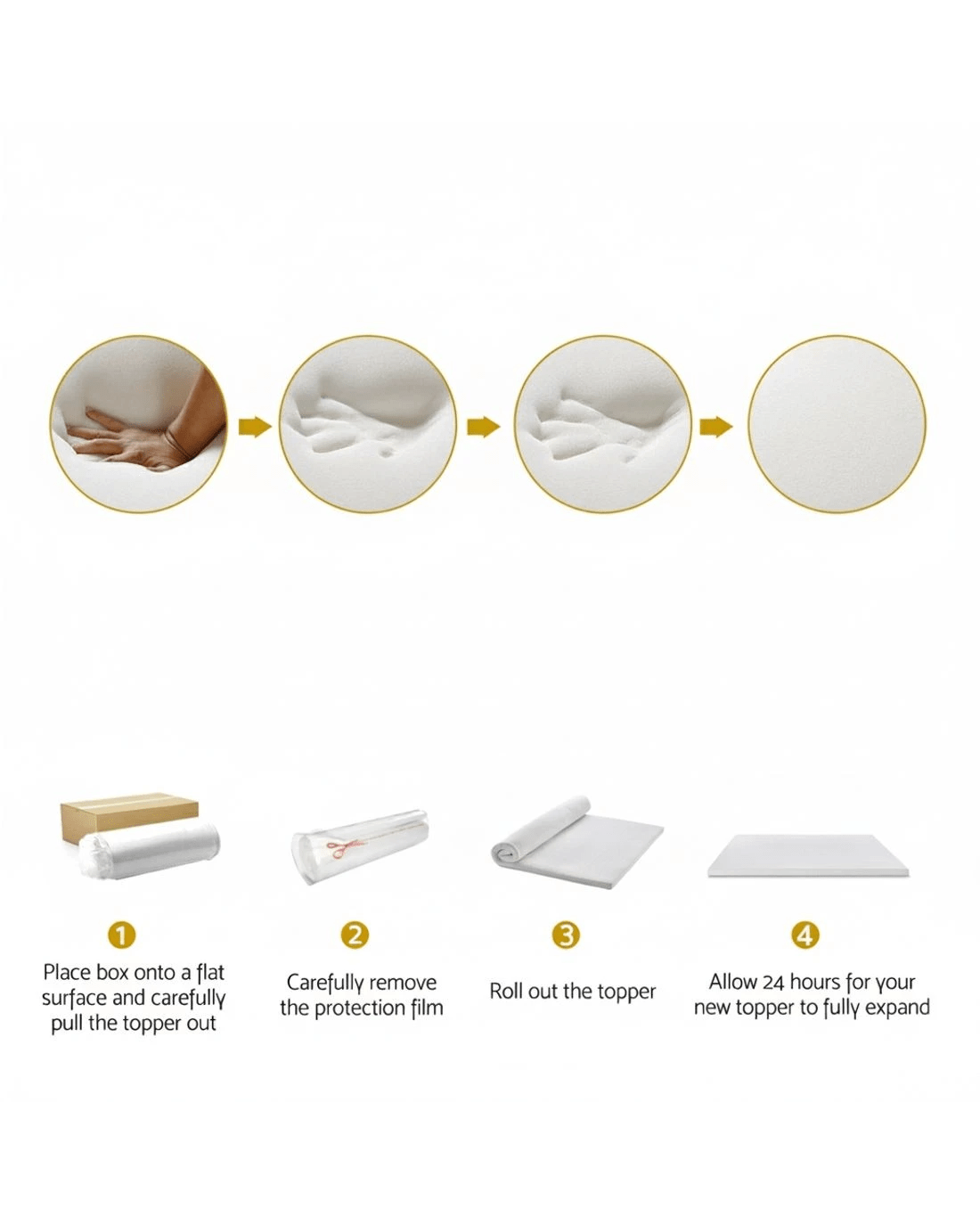 Add that extra comfort to your mattress with a Giselle Bedding Pillowtop Mattress Topper. If your mattress is less comfortable than it used to be, the difference our bedding topper makes is night and day. Made from 8cm thick 100% Visco elastic memory foam, the topper is designed to be cool and comfortable. The topper has a 7-zone contoured design with over 1000 supporting points for even weight distribution, increased air circulation and motion absorption. It comes with a breathable polyester, Jacquard knitted fabric cover that is machine washable so that you can have a clean bed every time. The topper is easily foldable and comes vacuum-packed for your convenience – simply unpack, roll out, and allow 24 hours for full expansion. Get your best sleep with the Giselle Bedding Pillowtop Mattress Topper. Our topper is available in single, double, queen and king sizes.