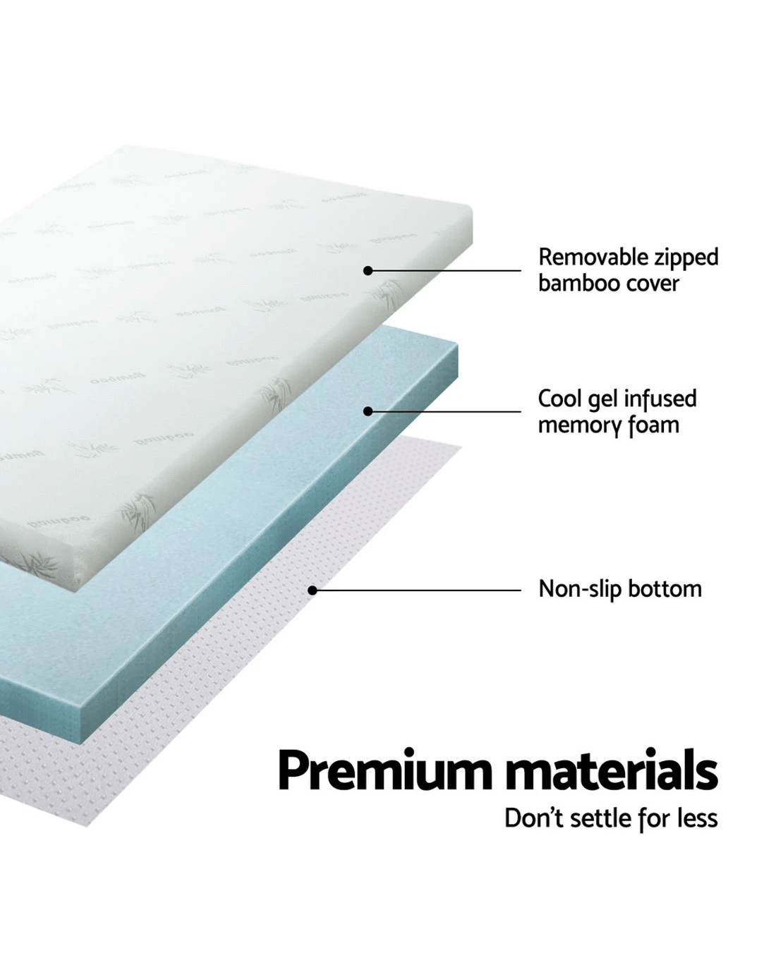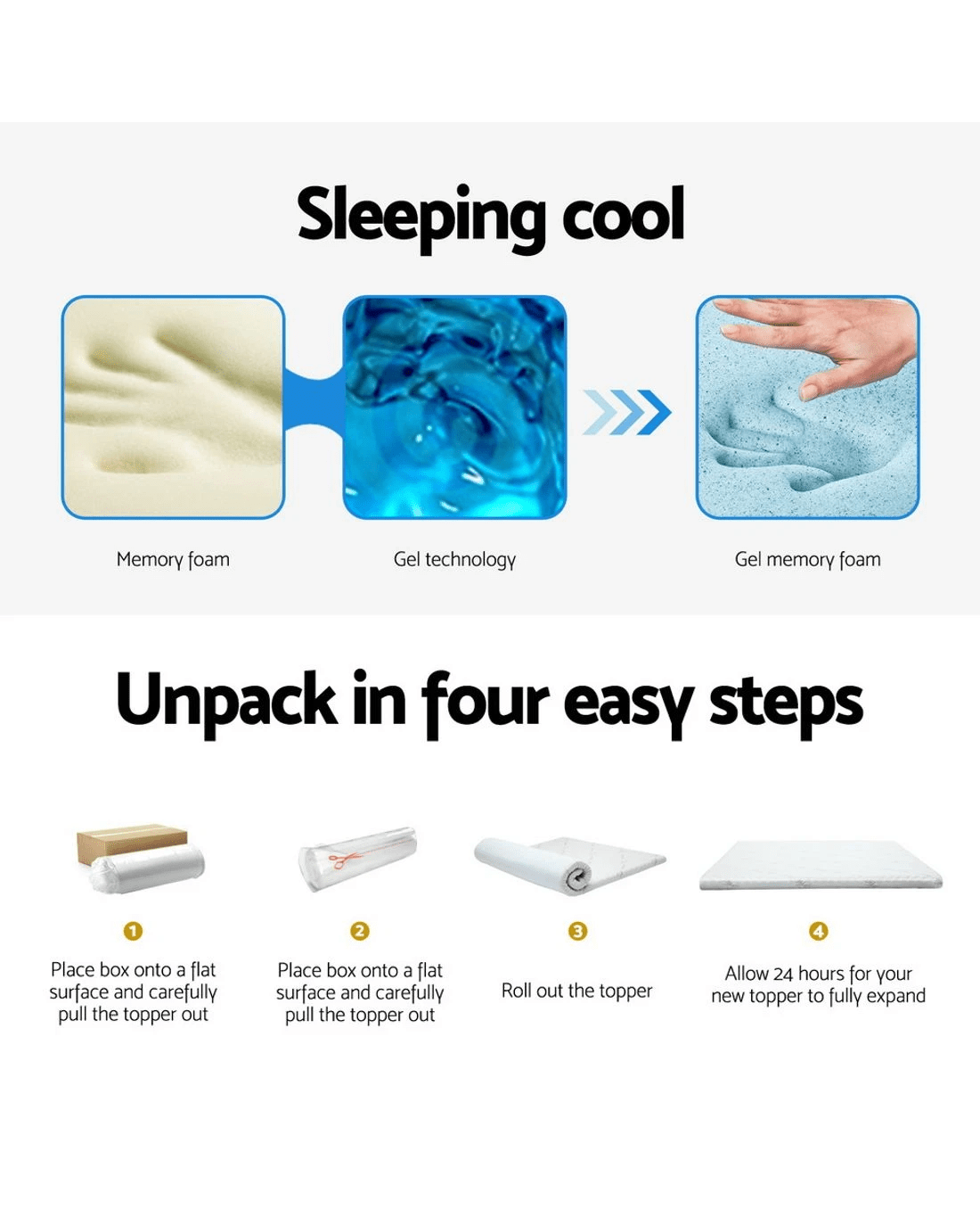 Add that extra bit of comfort to your mattress. An extra 10cm to be precise with our cool gel mattress topper. And the difference is simply wonderful. That's because our topper provides palpable relief to your pressure joints no matter how you sleep, a cooler sleeping surface and not least, individual contouring of your body shape thanks to the memory foam. The memory foam also helps to even body weight distribution, eliminate motion disturbance and dissipate body heat to keep your rest nice and cool. Eco-friendly in every way with its highly breathable bamboo fabric covering, our cool get mattress topper is just the extra that you need to turn your rest and sleep from good to great.