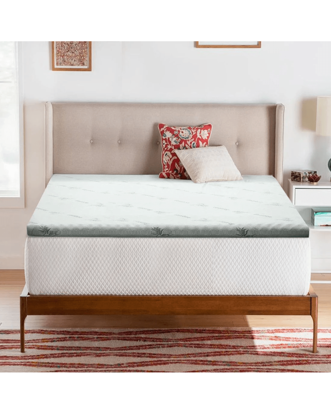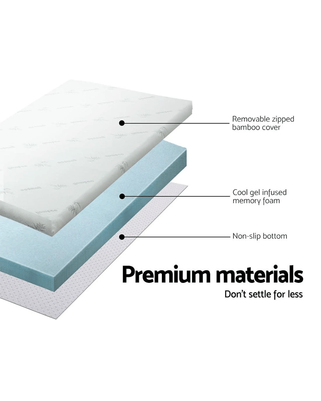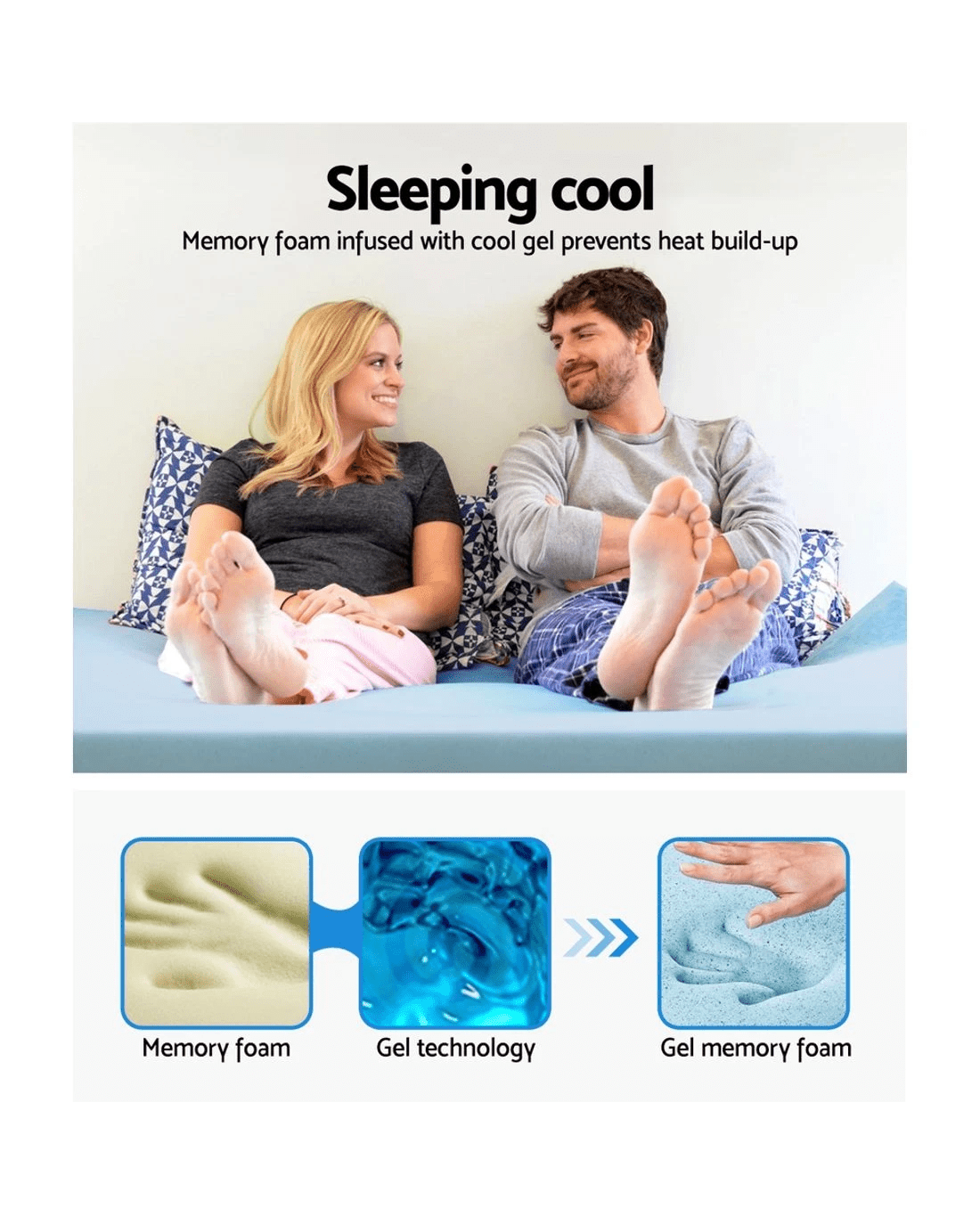 Add that extra bit of comfort to your mattress. An extra 8cm to be precise with our cool gel mattress topper. And the difference is simply wonderful. That's because our topper provides palpable relief to your pressure joints no matter how you sleep, a cooler sleeping surface and not least, individual contouring of your body shape thanks to the memory foam. The memory foam also helps to even body weight distribution, eliminate motion disturbance and dissipate body heat to keep your rest nice and cool. Eco-friendly in every way with its highly breathable bamboo fabric covering, our cool get mattress topper is just the extra that you need to turn your rest and sleep from good to great.