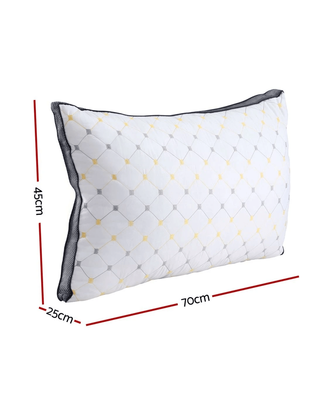 Experience comfort with the Giselle Bedding Microfibre Pillow, featuring a generous 1kg polyester fibre filling and 40g soft microfibre cover. The embroidery adds a touch of style to your bedroom, while the design ensures optimal support for every type of sleeper, from side to back to stomach positions.