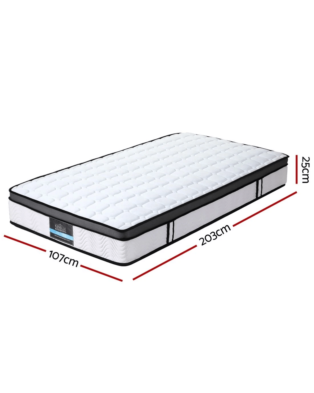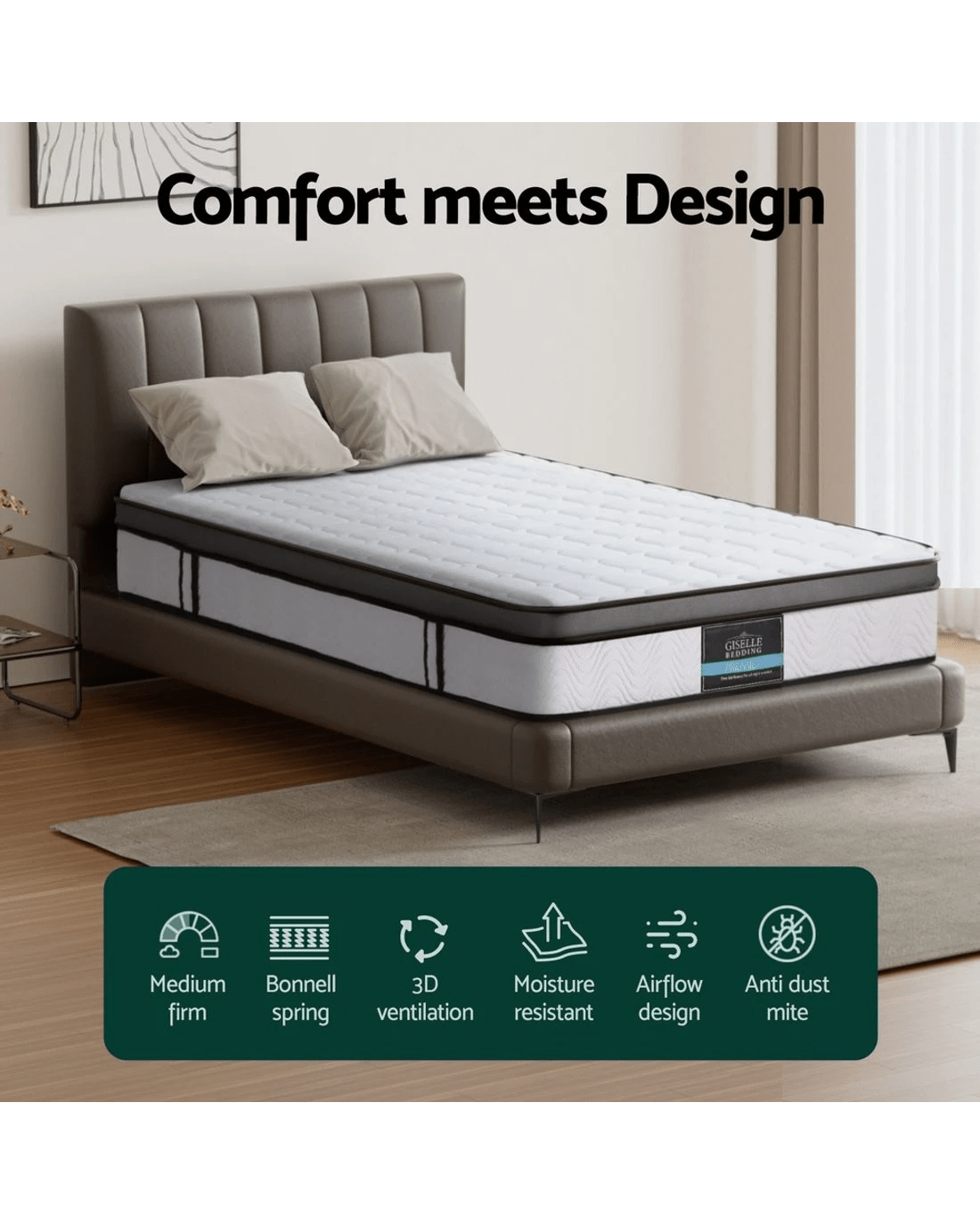 Indulge in luxury and comfort with the Giselle Bedding Sorrento Series Mattress. Boasting a generous 25cm thickness and a medium-firm feel, this mattress is crafted for both support and relaxation. Its Bonnell spring core features an enhanced 6-turn coil system, ensuring durability and stability for years to come. The inclusion of cool gel-infused memory foam and high-density foam provides cooling comfort and plush support, while the soft quilting top layer adds an extra layer of softness. Hypoallergenic and resistant to dust mites and mould, it promotes a healthier sleep environment. Experience superior support, even weight distribution, excellent ventilation, and a restful night's sleep with the Giselle Bedding Sorrento Series Mattress.