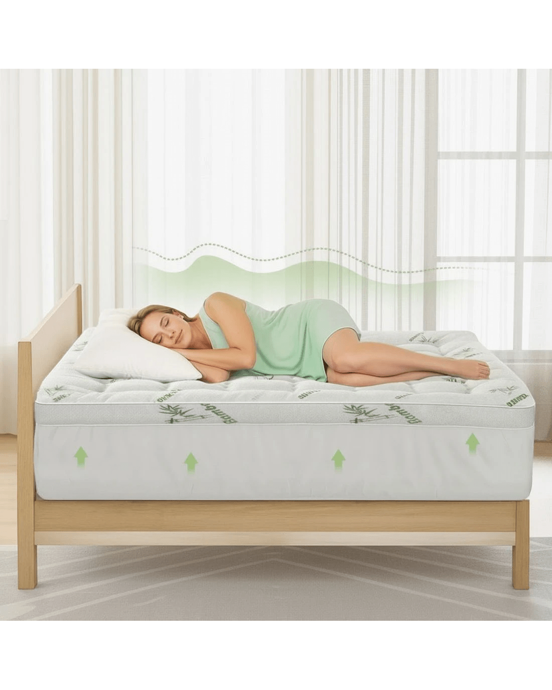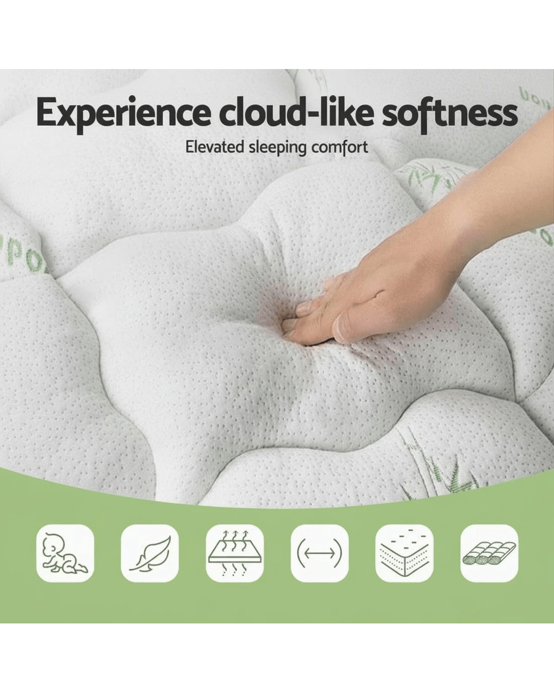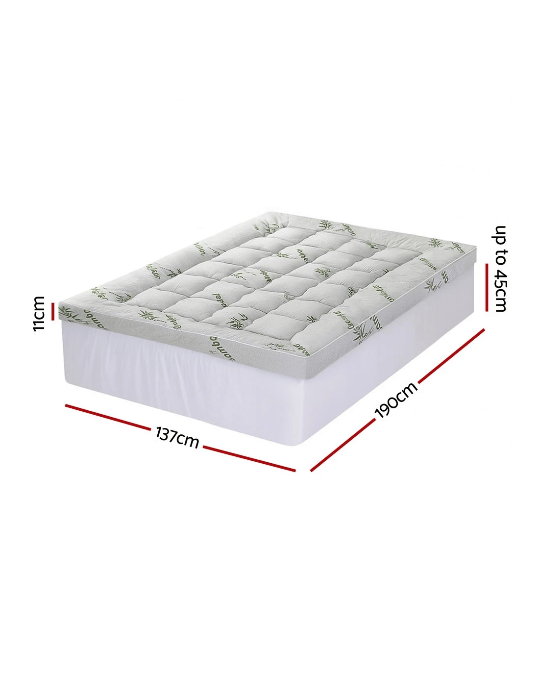 Elevate your sleep with the Giselle Bedding Pillowtop Topper, featuring an 11cm plush profile of 1500GSM hollow fiber beneath premium bamboo fabric. The 3D wave-check quilting enhances airflow while distributing weight evenly across your mattress. Designed for deep mattresses up to 45cm, this highly breathable topper arrives vacuum-packed for hygiene and is machine-washable for effortless maintenance.