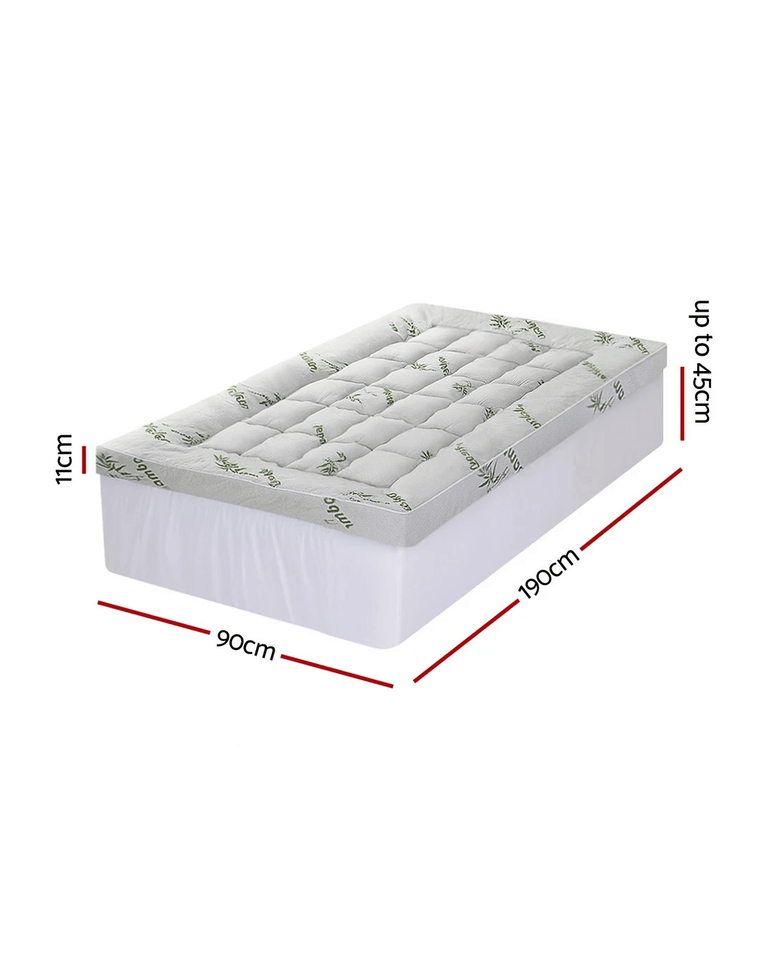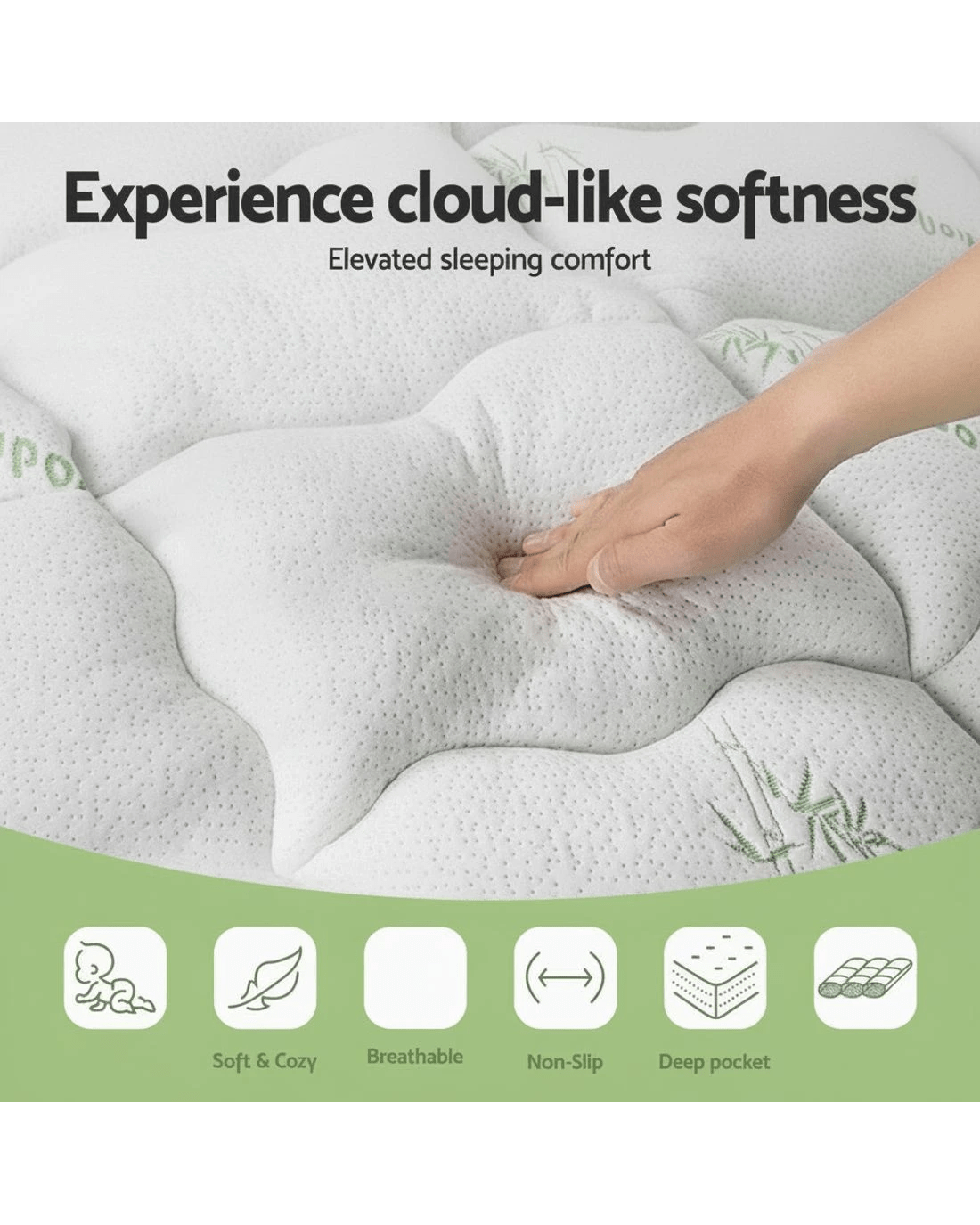 Elevate your sleep with the Giselle Bedding Pillowtop Topper, featuring an 11cm plush profile of 1500GSM hollow fiber beneath premium bamboo fabric. The 3D wave-check quilting enhances airflow while distributing weight evenly across your mattress. Designed for deep mattresses up to 45cm, this highly breathable topper arrives vacuum-packed for hygiene and is machine-washable for effortless maintenance.