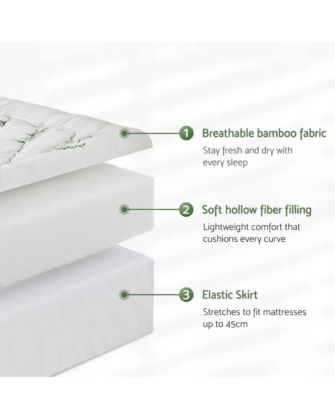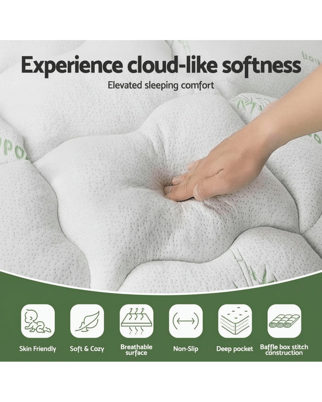 Experience cloud-like comfort with Giselle Bedding's 5cm Pillowtop Topper. Featuring a premium bamboo cover and 1000GSM hollow fiber filling, this topper enhances your mattress with balanced support. The 3D wave-check quilting promotes optimal airflow while evenly distributing body weight. Perfect for mattresses up to 45cm deep, its highly breathable design ensures cool, comfortable sleep. Arrives vacuum-packed for freshness and is machine-washable for easy care.