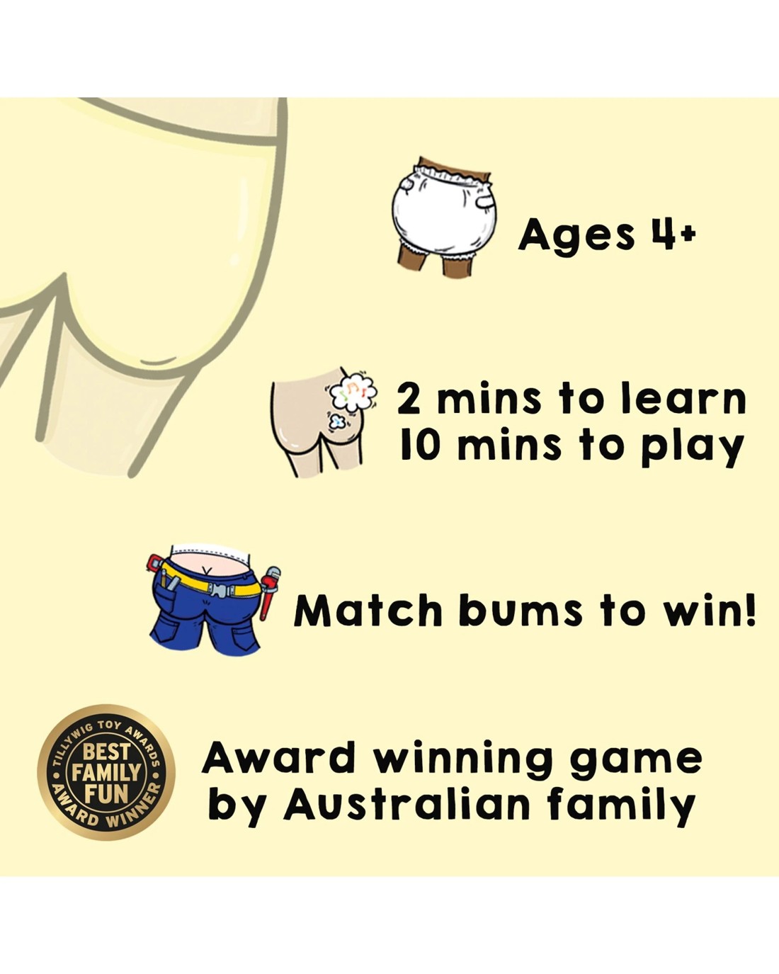 Do you have an Exploding Bum? Do you have a Tooty Bum? It's the cheeky version of Go Fish where you match different kinds of bums to win! This quick to learn and easy to play game features 25 family friendly but super cheeky bums to match, with optional rules that add even more laugh out loud fun like: Disco Bum: do a dance move when you get the Disco Bum match Golden Bum: get 2 points at the end of the game with the Golden Bum match Pirate Bum: say “Yarr, I have a pirate bum” in a pirate voice when you get the Pirate Bum match The Go Bum Back(side) Story: Go Bum was made by Australian Evan Turner and his 7 year-old son Levi as a creative project during covid lockdown home schooling in 2020. It grew so much amongst family and friends they started selling at markets, and now teaming up with illustrator Dewy Venerius, they're bringing it to you! Ages: 4 + | Players: 2 - 7| Playtime: 10 Mins