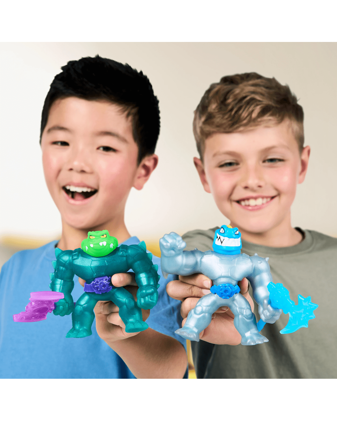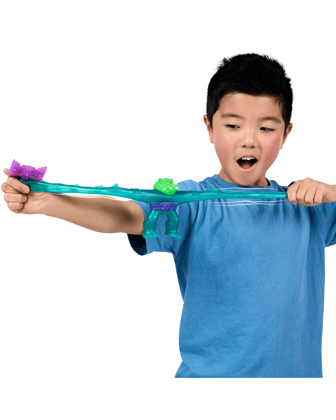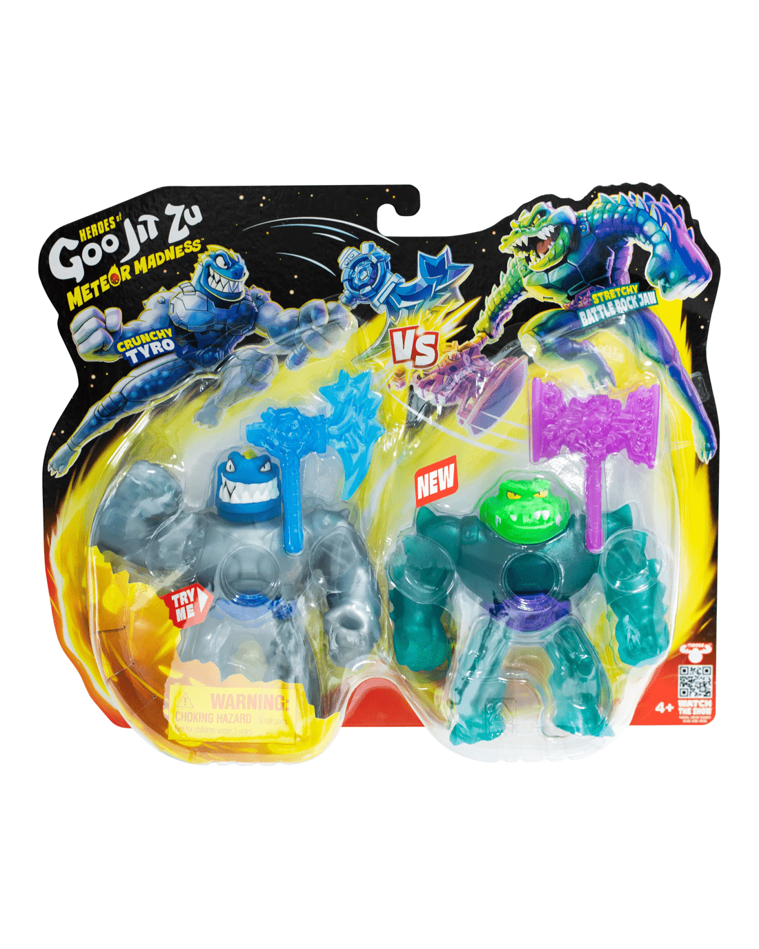 Let's kick some goo! Brace yourself for a meteoric showdown with the all-new Heroes of Goo Jit Zu Meteor Madness Versus Pack. Will Tyro the T-Rex be strong enough to defeat Rock Jaw, or will evil prevail? Tyro has been equipped with a powerful, interchangeable Power Axe, designed for extreme stretch battle strikes against Rock Jaw. But will Rock Jaw's Power Hammer hold up against Tyro's tyrannosaurus attacks?  With bold styling and the ability to stretch up to three times their size, Meteor Madness Tyro is ready to take action-packed adventure to the next level, unleashing stretchy battle action havoc on the evil  Rock Jaw!